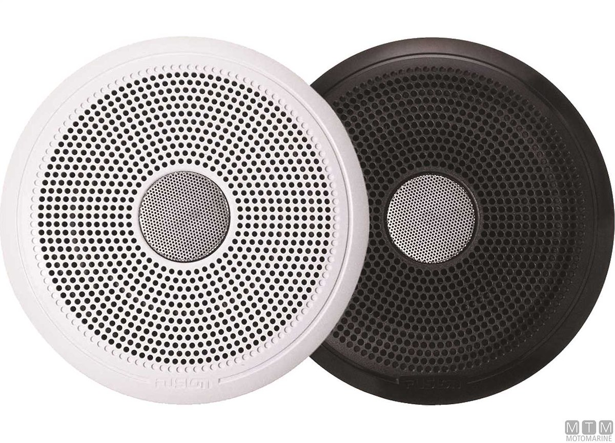 Coppia di altoparlanti marini Fusion XS a due vie impermeabili IP65. Tecnologia a cono curvato con tweeter Aluminum Dome. Forniti con due griglie bianche e due griglie nere intercambiabili.