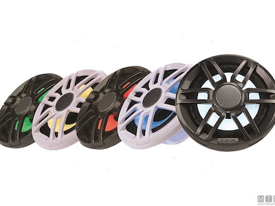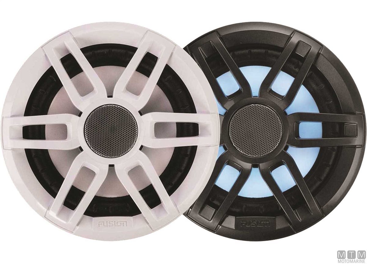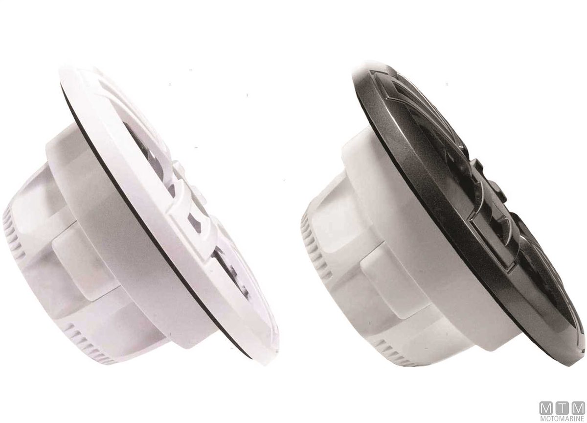Coppia di altoparlanti marini Fusion XS a due vie impermeabili IP65. Tecnologia a cono curvato con tweeter Aluminum Dome. Forniti con griglia bianca e grigia. Dotati di luce LED RGB che può essere controllata dal telecomando opzionale.