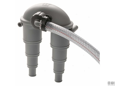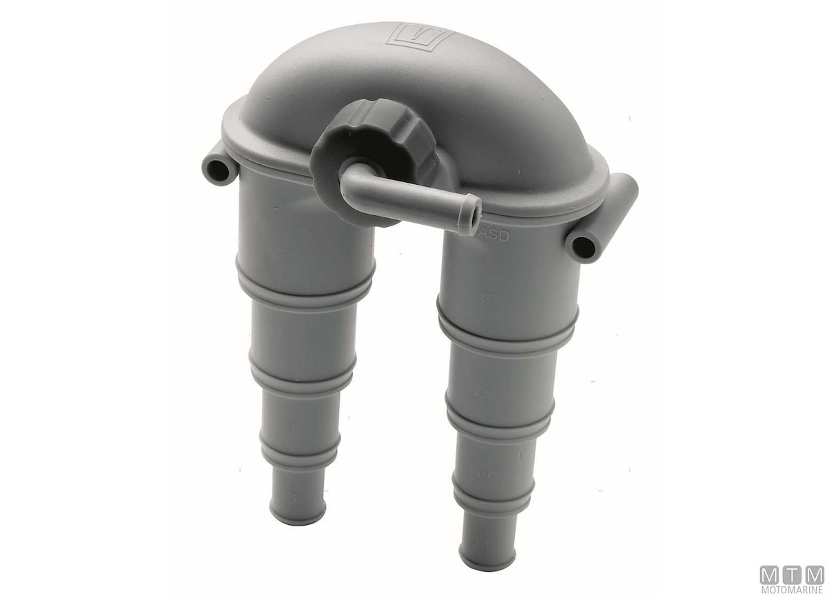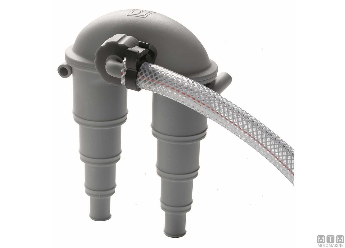 Antisifoni per impianti di scarico sotto la linea di galleggiamento. Con valvola/portagomma ruotabile e smontabile per una facile manutenzione.Se il livello dell'iniezione dell'acqua di raffreddamento nello scarico del motore si trova a meno di 15 cm sopra la linea di galleggiamento oppure sotto la stessa, quando il motore viene spento, l'acqua di raffreddamento può penetrare nell'impianto di scarico e quindi nel motore. Tale pericolo può essere evitato installando un antisifone almeno 40 cm sopra la linea di galleggiamento.