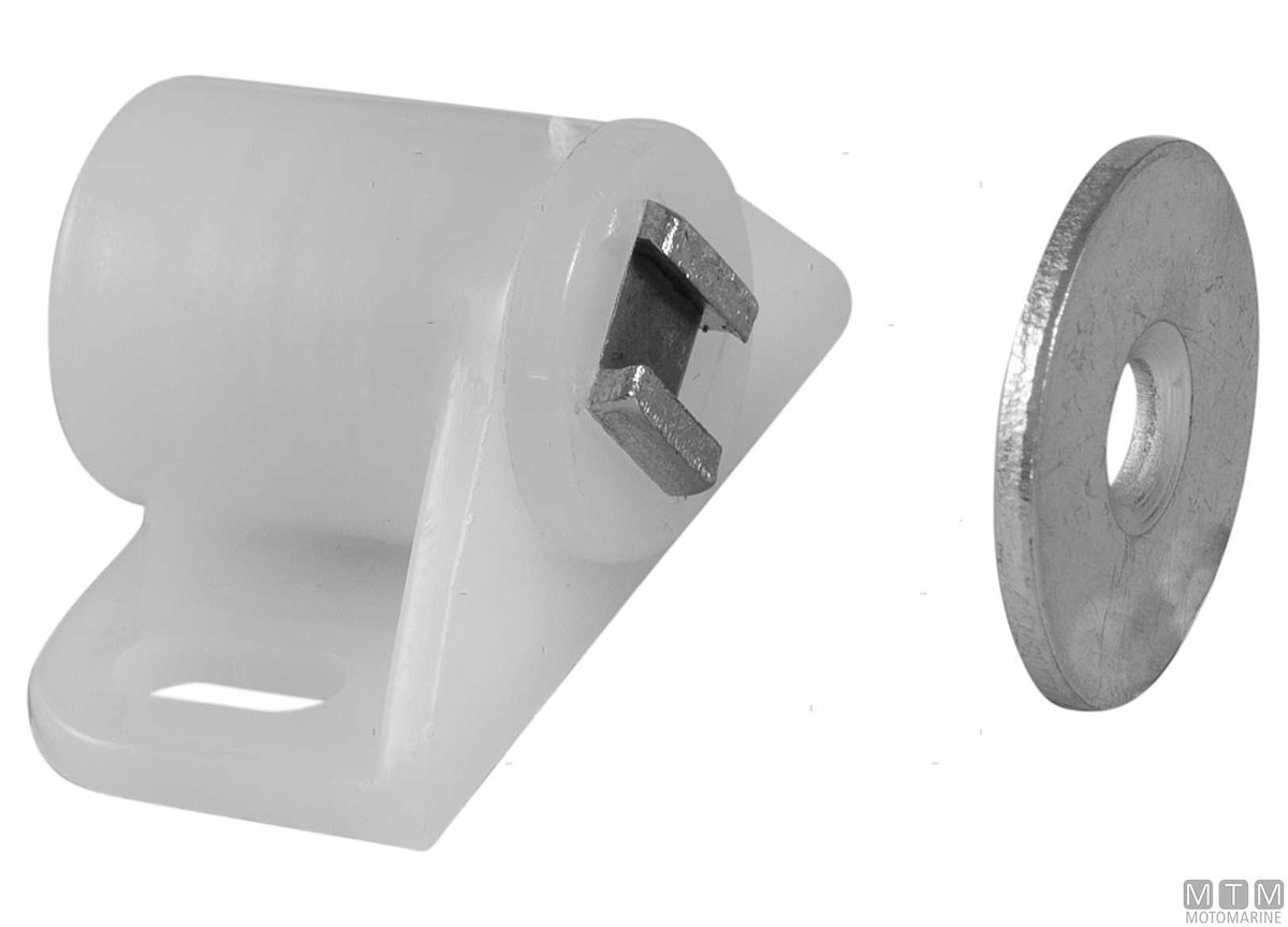 Ferma porte e portelli magnetico in plastica bianca con rondella. Composto da due parti che si montano separatamente sulla parte fissa e sulla parte mobile. Venduto in coppia.