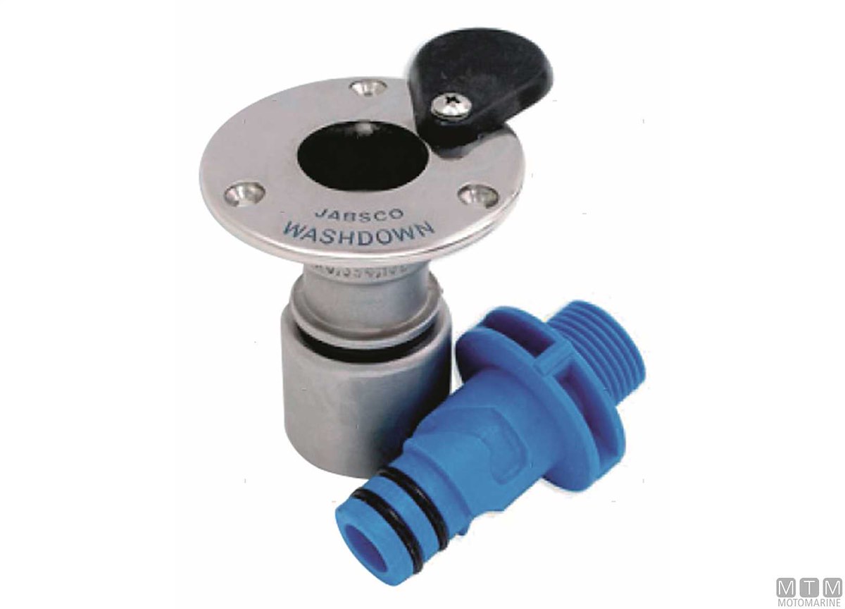 Attacco rapido da ponte in Acciaio Inox 316 con innesto per tubo acqua. Permette di attaccare e staccare rapidamente il tubo acqua anche sotto pressione mantenendo il ponte libero da ostacoli. Connessioni: sotto coperta attacco da 1/2" femmina, sopra coperta attacco da 3/4" maschio.