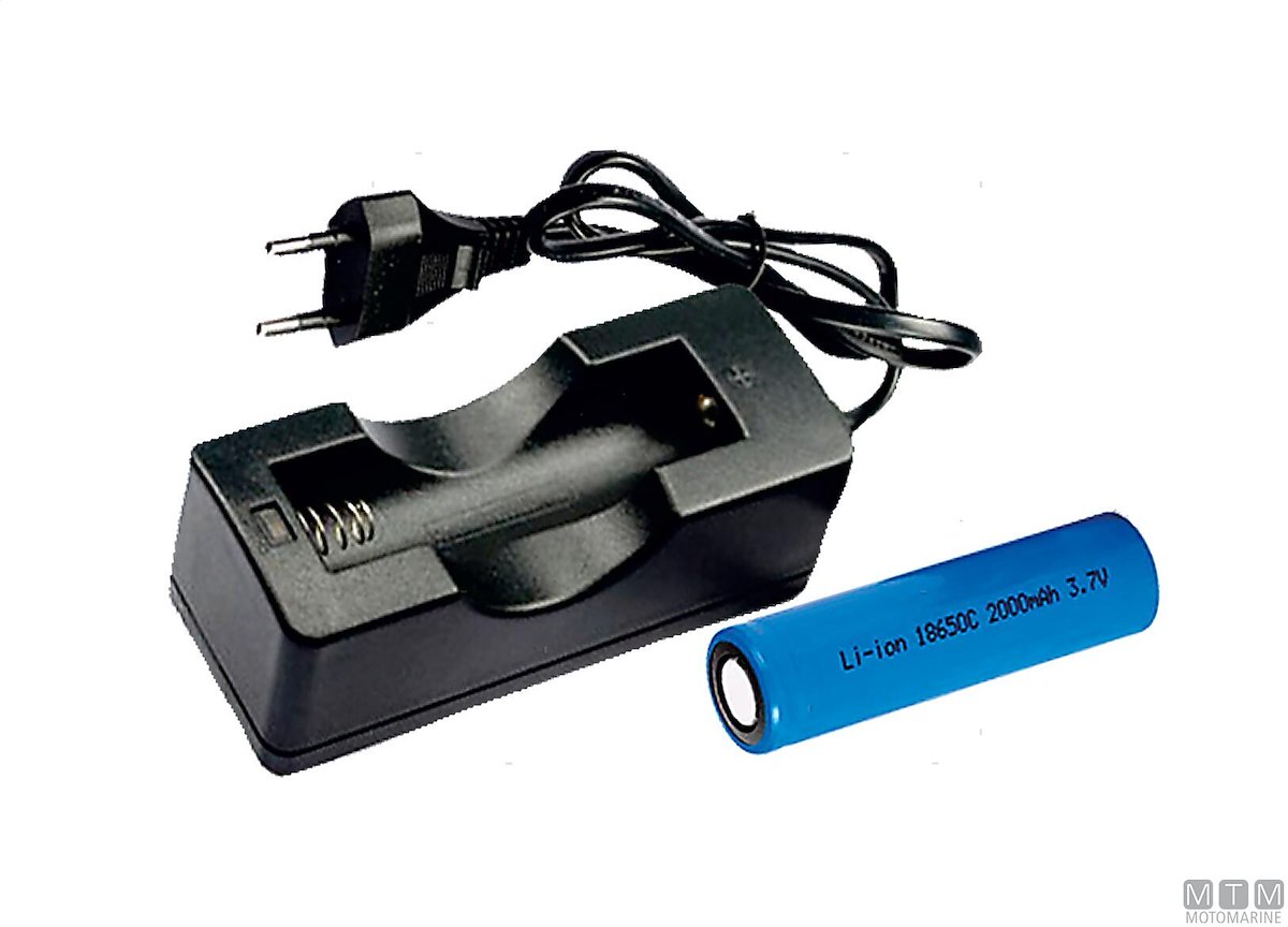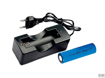 Batteria ricaricabile tipo 18650 e caricabatterie.