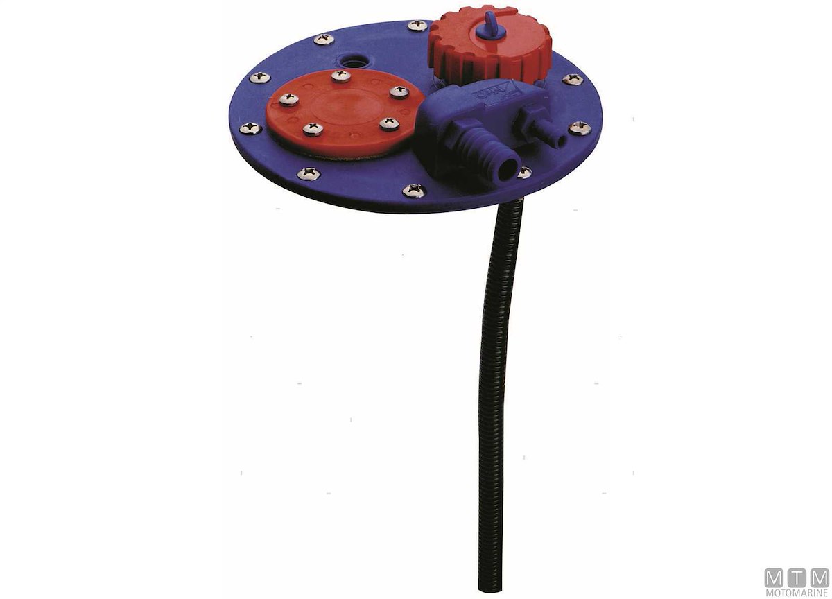 Boccaporto di ispezione completo di raccordi per il funzionamento dei serbatoi in Plastica ad installazione fissa composto da: Disco boccaporto in Nylon rinforzato - tappo filettato con sfiato - pescante con portagomma ø 12 mm - sfiato ø 17-19 mm - flangia chiusura foro misuratore livello.