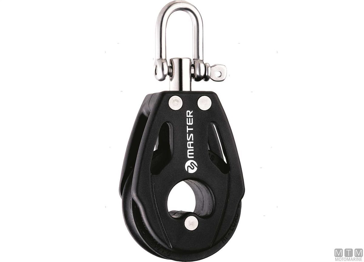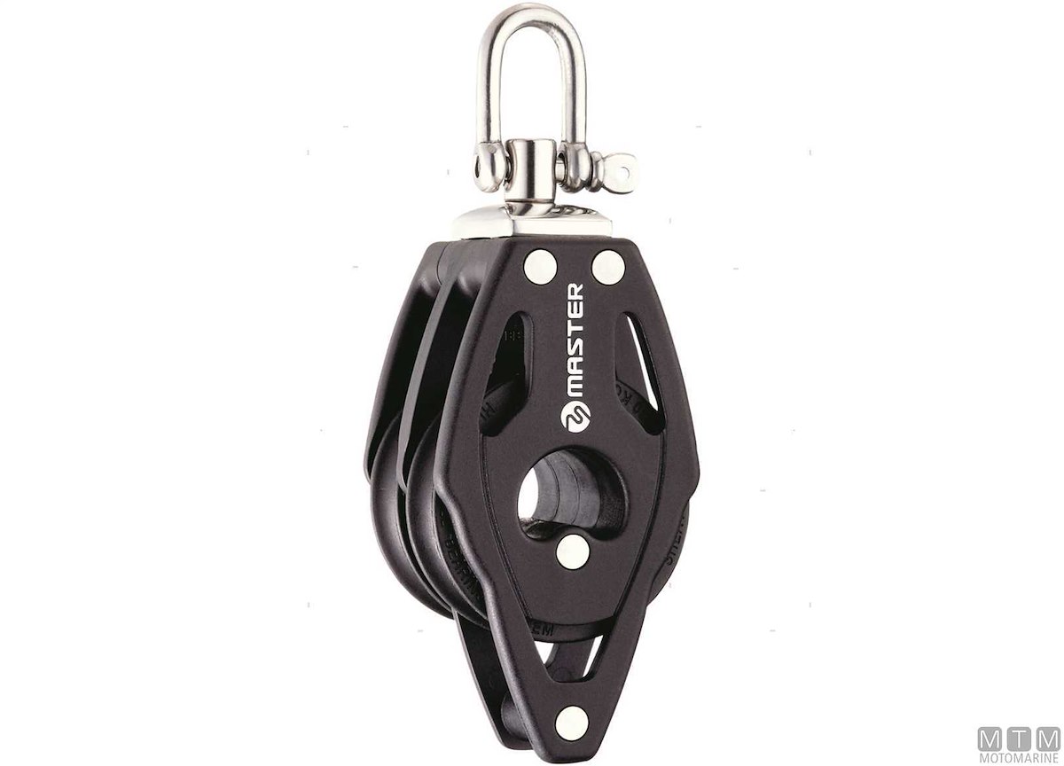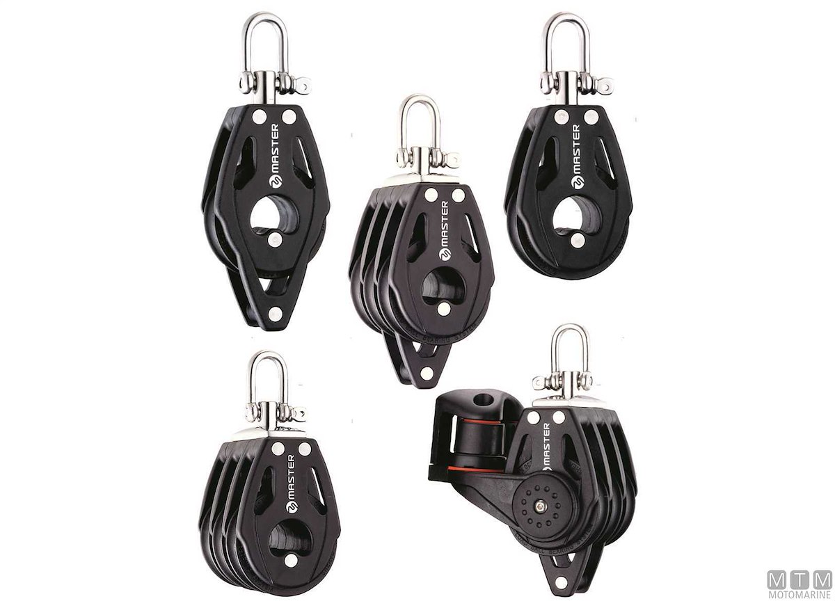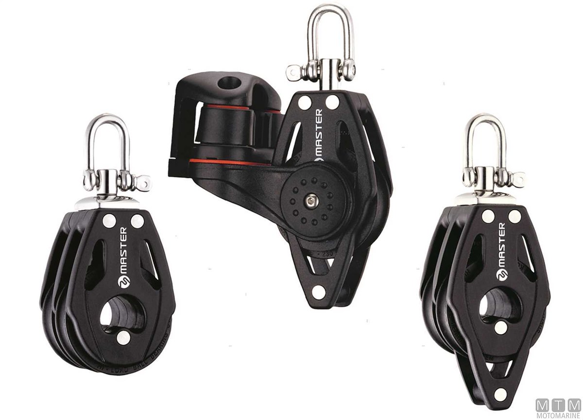 Bozzelli Master su sfere con puleggia da 75 mm. Cassa in materiale composito ultra leggero rinforzato con fibra e UV resistente. Il grillo girevole può essere bloccato in due posizioni grazie alla leva di blocco. Sfere ad alto scorrimento in Delrin stabilizzato UV.