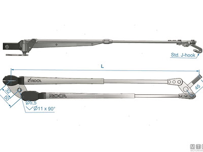 Bracci telescopici Roca a pantografo in Acciaio Inox con attacco J-Hook. Per tergicristalli W10/W12 e per qualsiasi tergicristallo con perno 13,8 mm. Campo di azione a bordi paralleli tipo P.