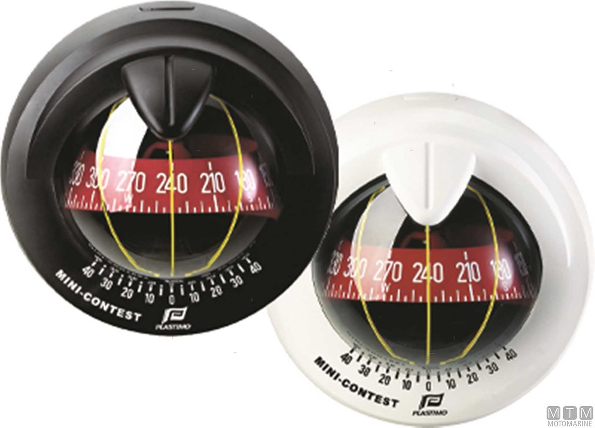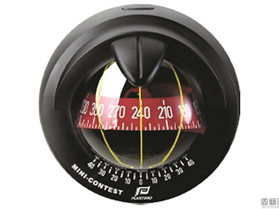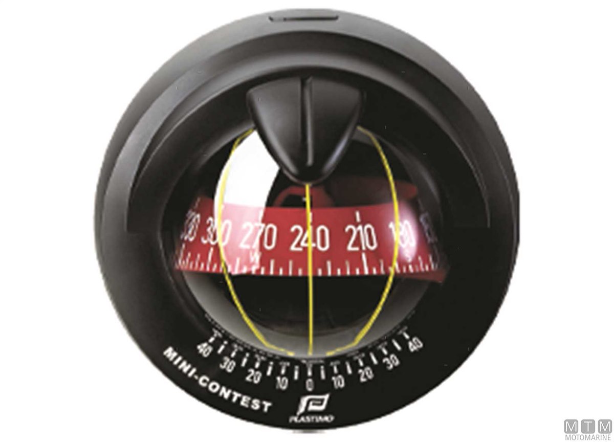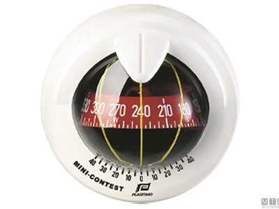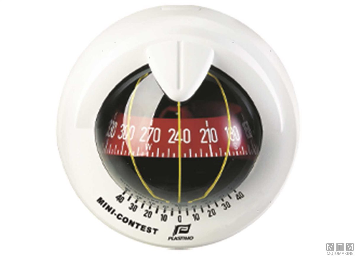 Bussola Plastimo Mini Contest a incasso verticale. • Diametro rosa 81 mm • Rosa rossa con graduazione bianca ogni 5° • Ideale per barche a vela fino a 9 metri• Provvista di inclinometro e cover • Illuminazione LED 12/24 V di serie (non tagliare i fili per evitare danni al LED)
