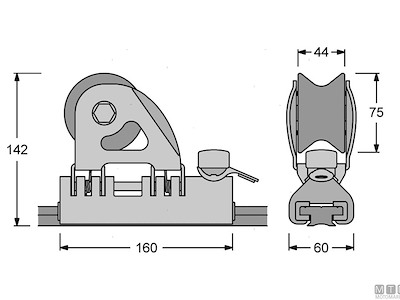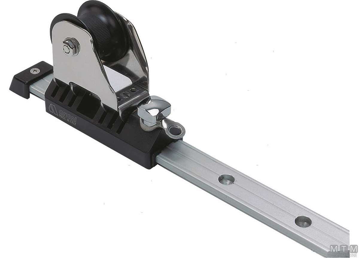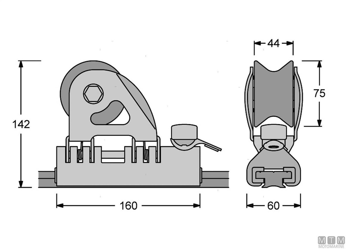 Carrello in Alluminio ossidato Nero su pattini in Nylon a basso attrito. Supporto puleggia in Acciaio AISI 316 orientabile (± 50°). Puleggia in Alluminio con doppio cuscinetto laterale a sfere. Fermo d’arresto in Acciaio AISI 316 con posizione di disinserimento. Arricavo frontale.
