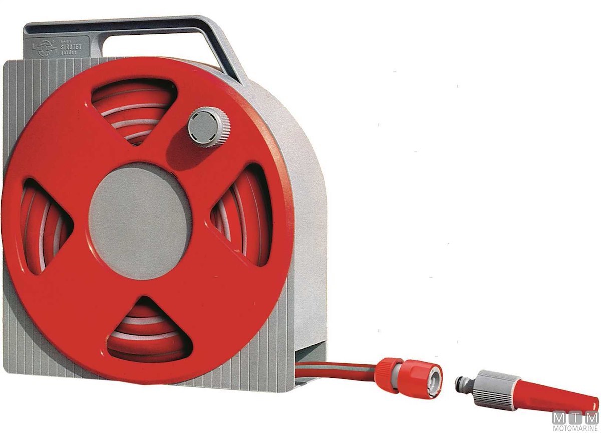Cassetta avvolgitubo portatile completa di lancia e raccordi rapidi per collegamento al rubinetto.