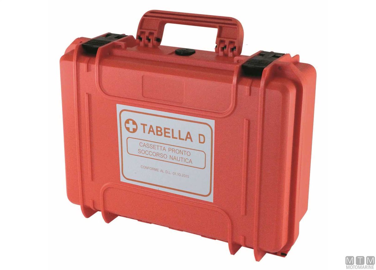Cassetta pronto soccorso valigetta in contenitore stagno IP67 con guarnizione ermetica, valvola automatica di pressurizzazione, manico ergonomico, chiusura di sicurezza a doppio step e doppia predisposizione lucchetto. Contenuto come da tabella D, regolamentare DM 10/03/2022 per naviglio: