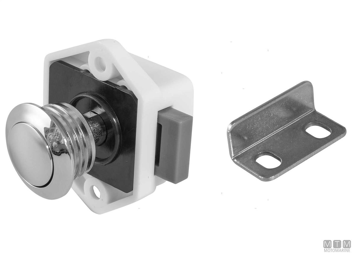 Chiusura a pulsante per portelli e cassetti completa di scontro e viteria. Cassa in ABS, pulsante cromato e parti meccaniche in lega Zamac. Dimensioni 35 x 48 mm.