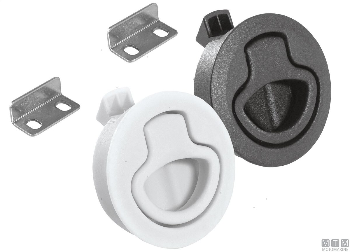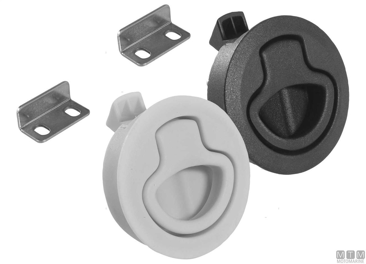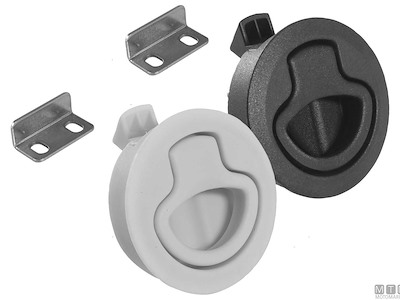 Chiusura a spinta per portelli e paglioli completa di scontro e viteria. Corpo in Nylon con montaggio a incasso.