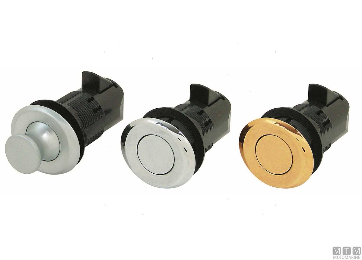 Chiusura a spinta Southco con pulsante a filo e flangia tonda. Il pulsante a scatto rimane a filo in posizione chiusa e fuoriesce in posizione aperta. Corpo e dado in Nylon Nero, flangia e pomello in Ottone. Da completare con un aggancio fisso o regolabile.