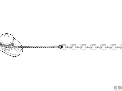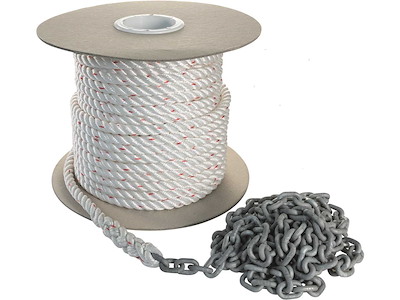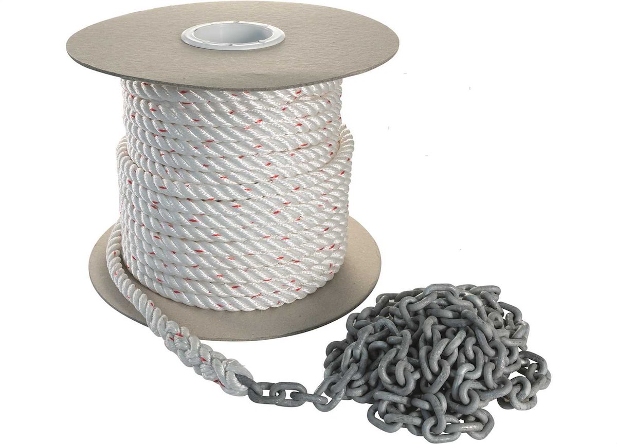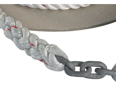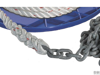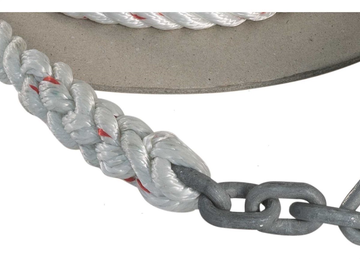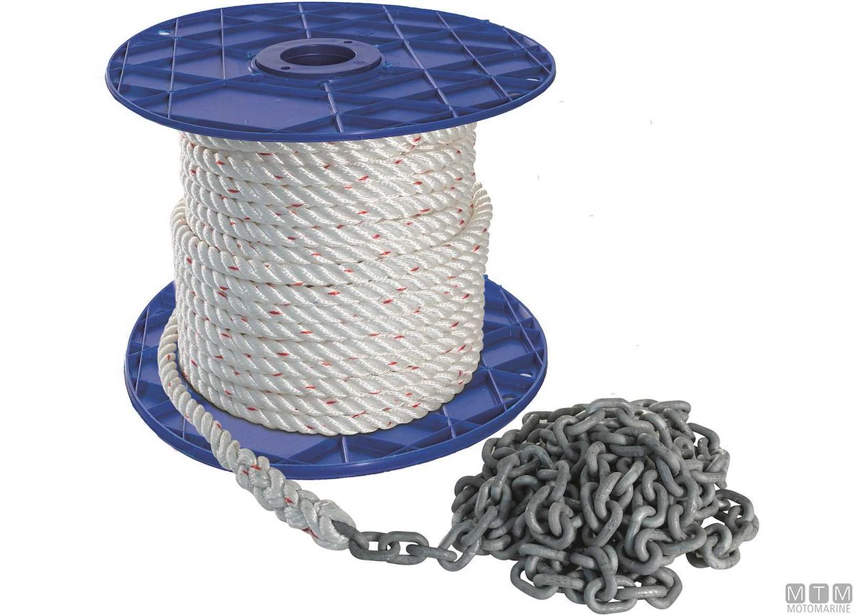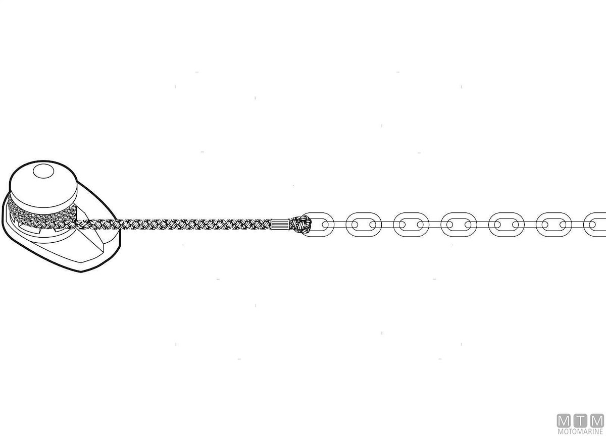 Sistema cima/catena per ancora pronto per l'uso con impiombatura a sagoma perfetta. Catena calibrata DIN766-G40 in Acciaio Zincato e cima in Poliestere 3 legnoli ad alta tenacità resistente all'abrasione.