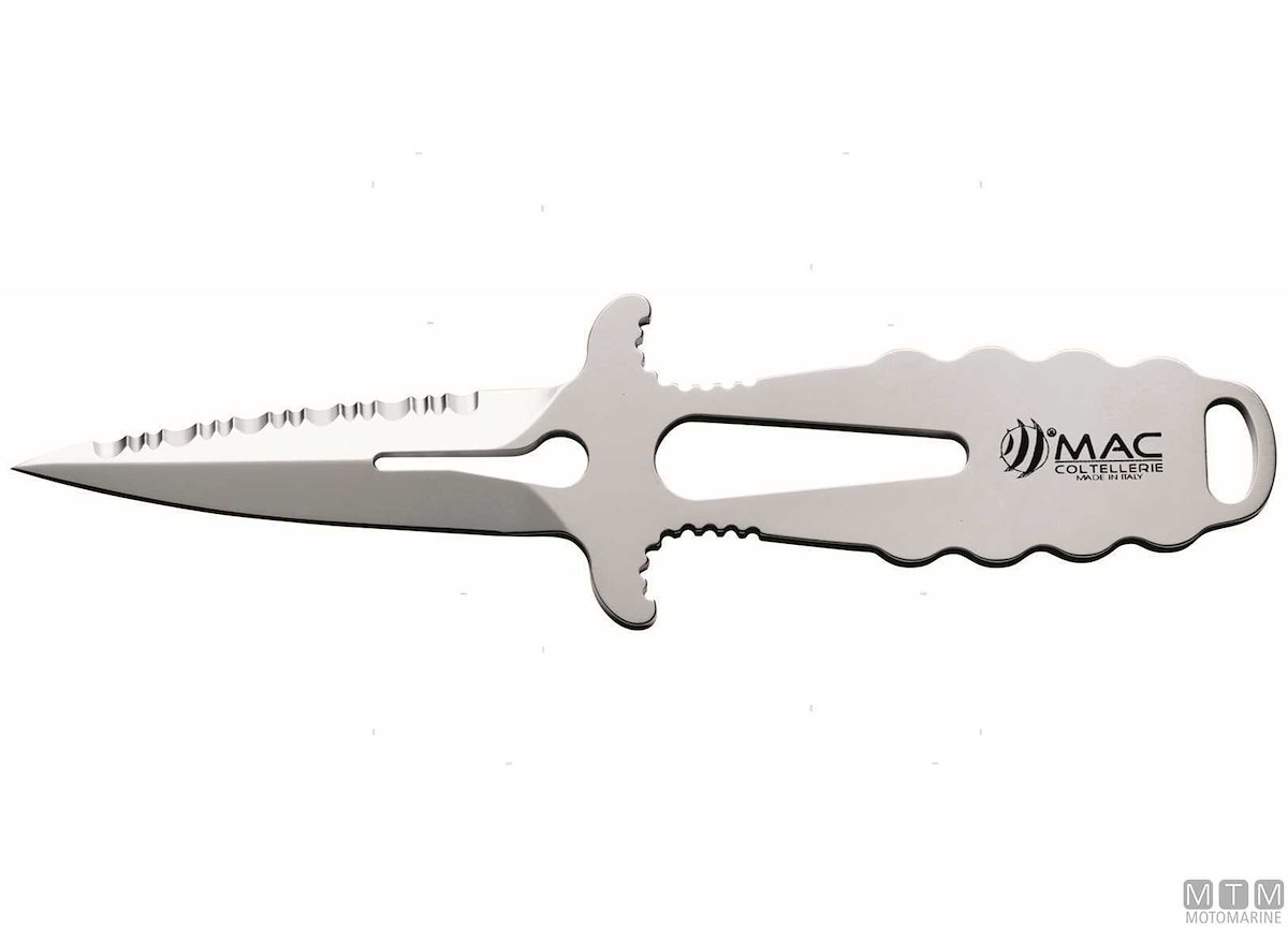 Coltello sub compatto con tagliacima e foro gira-grilli. Il manico in Acciaio Inox e lo spessore ridotto di soli 4 mm lo rendono un coltello perfetto per sub. Completo di fodero e cinghie. Lama in Acciaio Inossidabile W1.4116. Dopo l'uso sciacquare la lama con acqua dolce e ingrassarla.