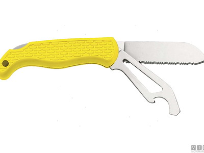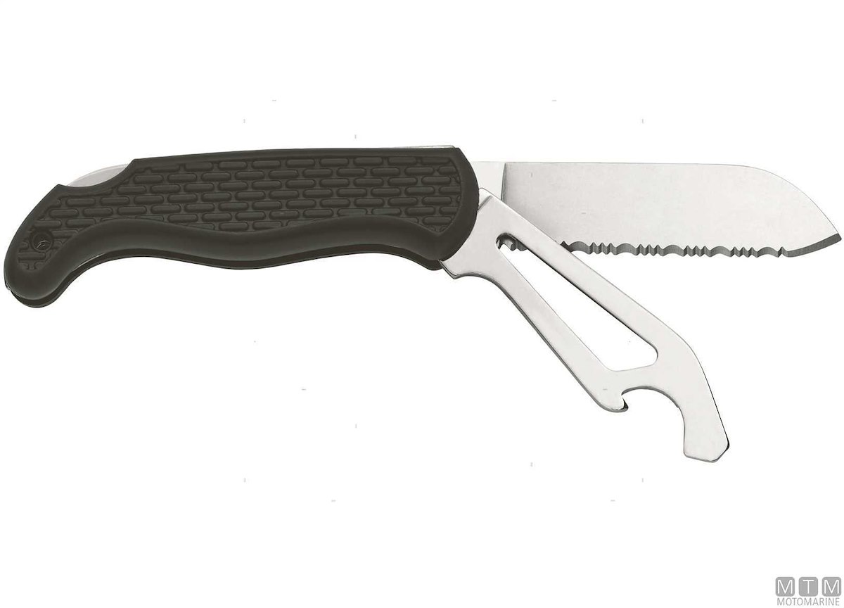 Coltello a serramanico con bloccalama, gira-grilli, apribottiglia e cacciavite a taglio. Manico in mescola PP/TPE, lama in Acciaio Inossidabile W1.4034.