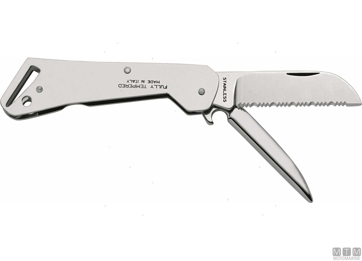 Coltello a serramanico in Acciaio Inossidabile. Completo di foro gira-grilli, cavigliera aprinodi e apribottiglie. Manico e lama in Acciaio Inossidabile W1.4028.