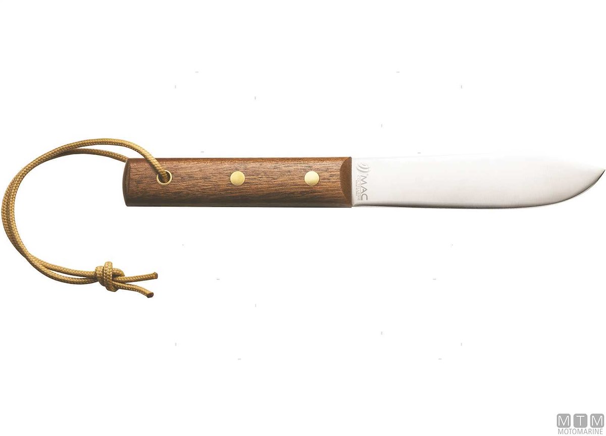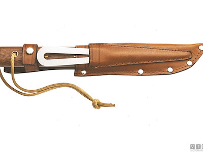 Coltello da nostromo tradizionale in legno di Mogano con caviglia, gira-grilli e fodero in cuoio lavorato. Lama in Acciaio Inossidabile W1.4116.