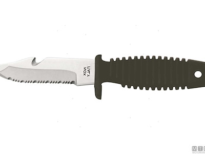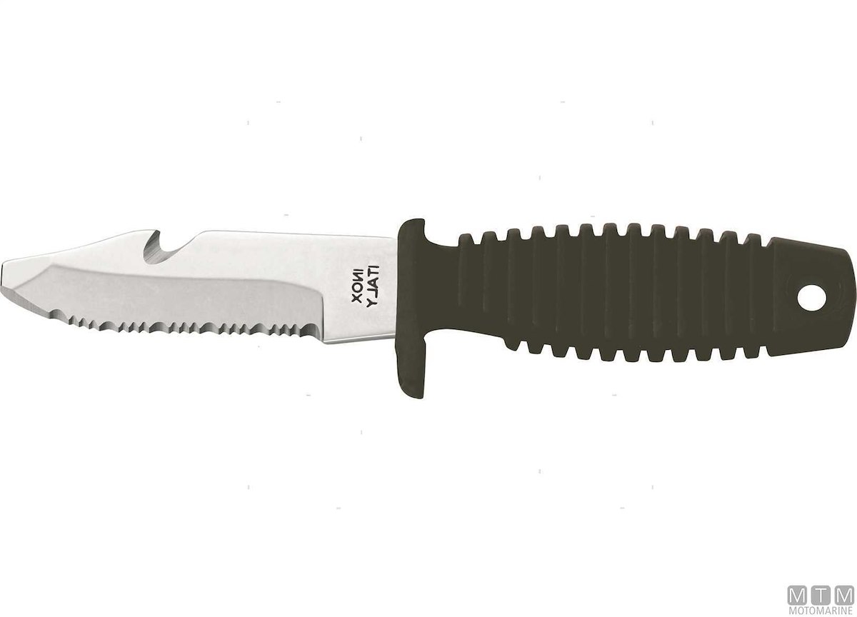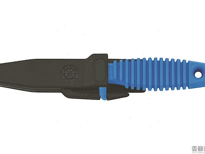 Coltello Sub compatto senza punta con tagliacima, fodero e cinghie. Lama in Acciaio Inossidabile W1.4028. Dopo l'uso lavare la lama con acqua dolce e ingrassarla.