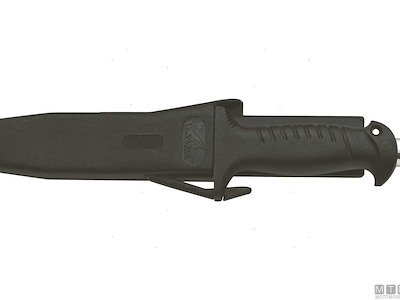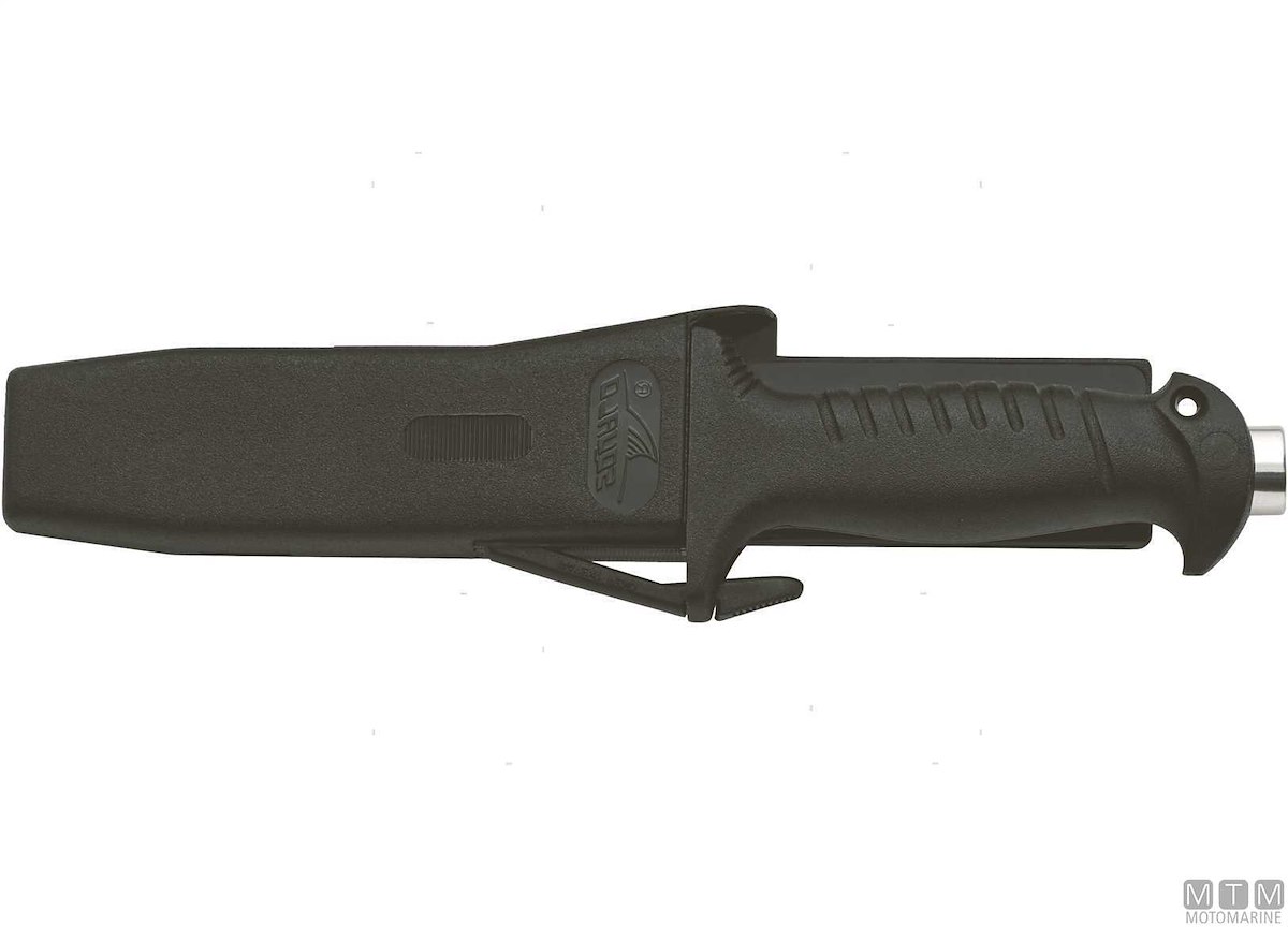 Coltello Sub professionale con tagliacima, martello su manico, fodero e cinghie. Lama in Acciaio Inossidabile W1.4116. Dopo l'uso lavare la lama con acqua dolce e ingrassarla.