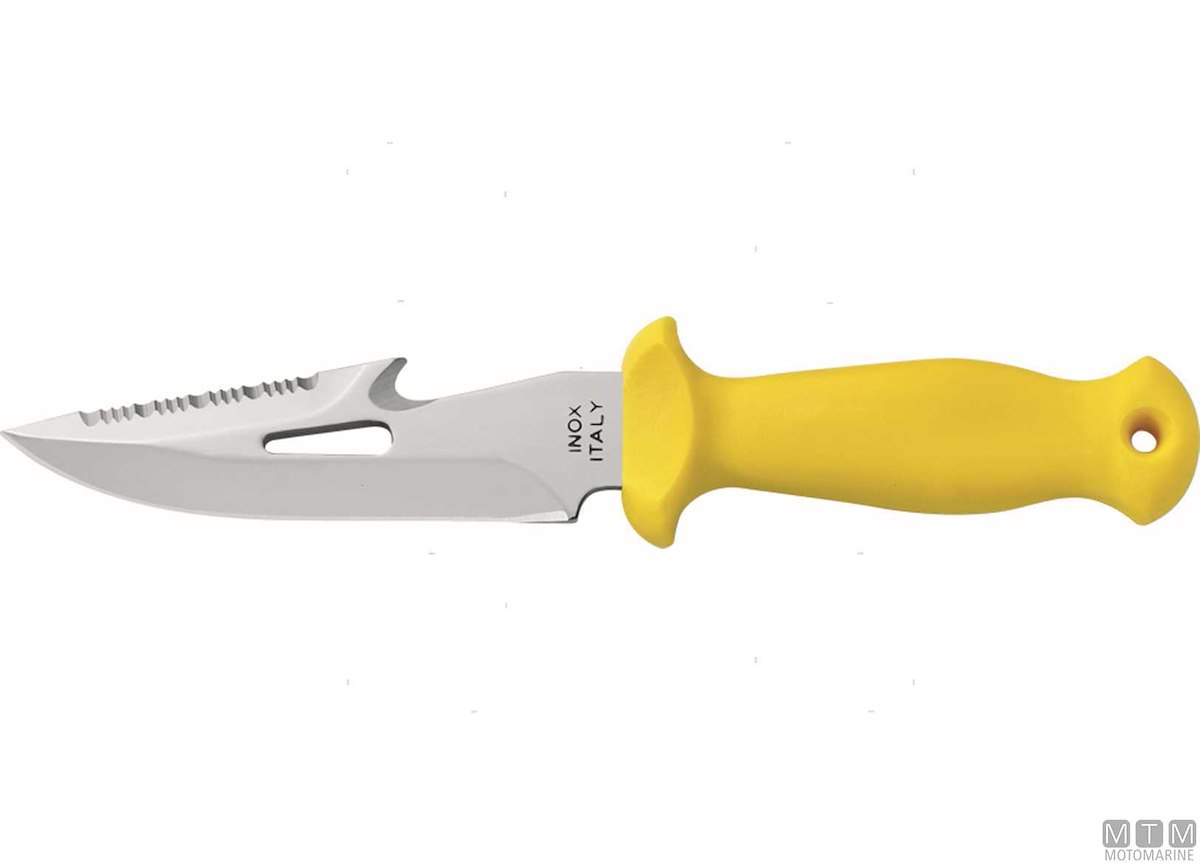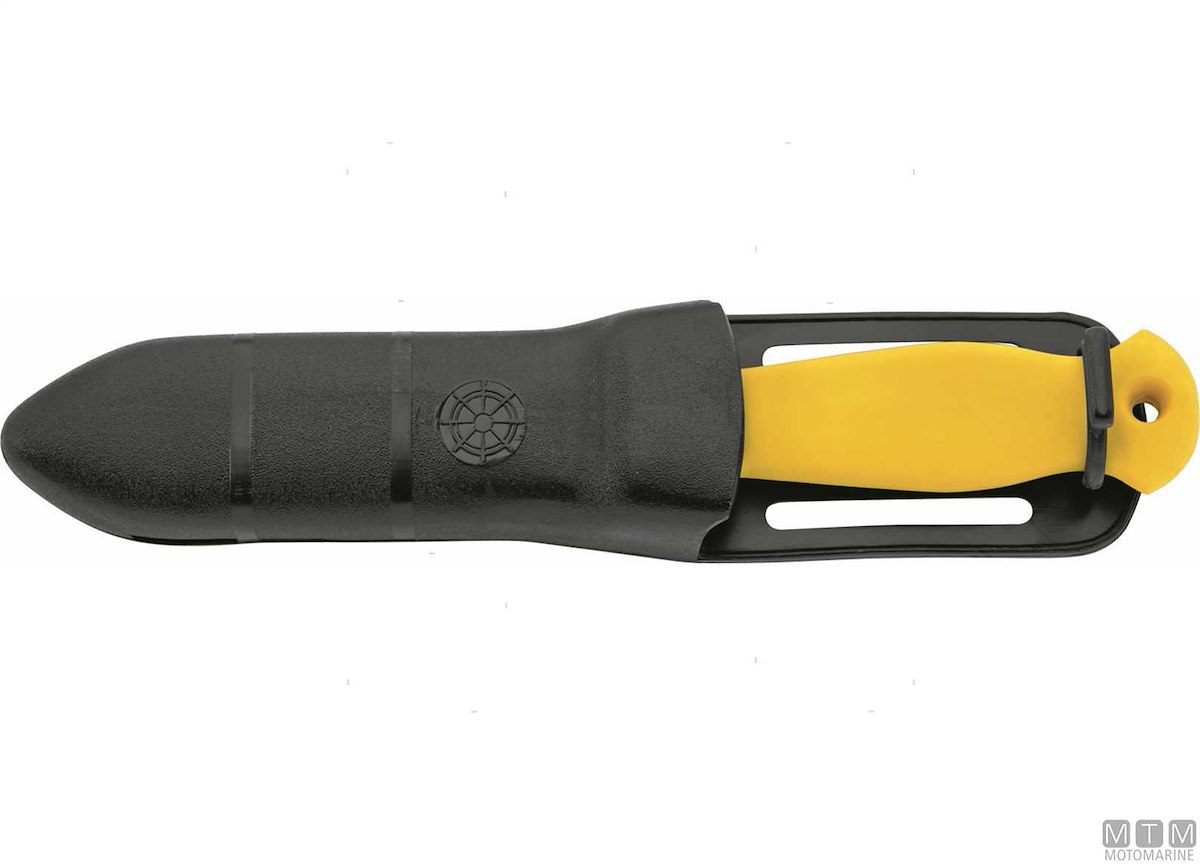 Coltello Sub con tagliaspago e giragrilli. Completo di fodero e cinghie. Lama in Acciaio Inossidabile W1.4116. Dopo l'uso sciacquare la lama con acqua dolce e ingrassarla.