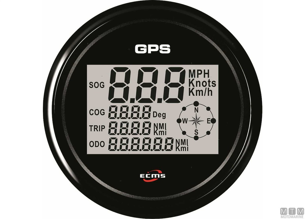 Contanodi digitale GPS Ecms All Black 12/24V completo di sensore GPS, cavetti e attacco Molex. Cornice in Acciaio Inossidabile 316 con finitura nera. Frontalino impermeabile IP67 con lente bombata anti-appannamento. Calcola la distanza percorsa dall'imbarcazione e permette di gestire le distanze delle singole tratte misurando la velocità in Nodi, MPH oppure Km/h. Quadrante con retroilluminazione personalizzabile multicolore LED.