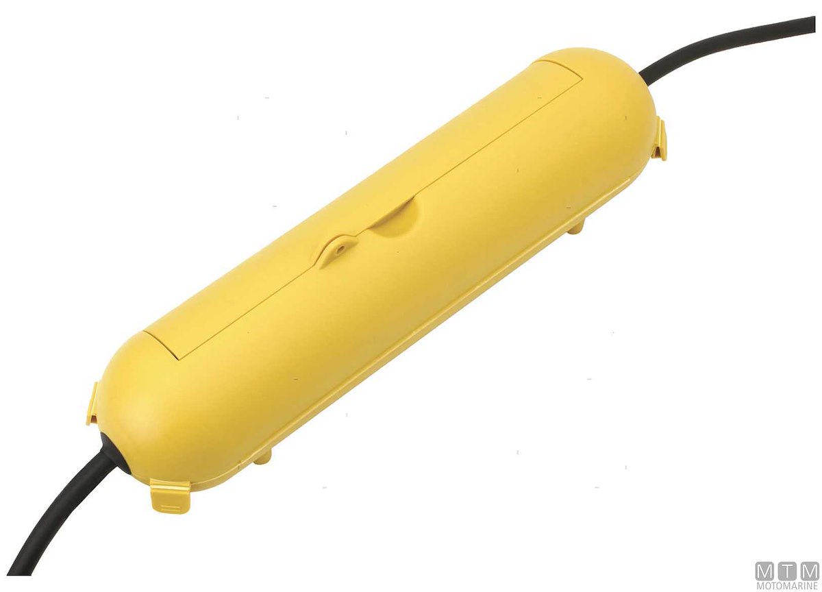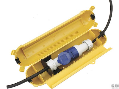 Contenitore di protezione stagno in plastica antiurto per prese e spine elettriche. Completo di portalucchetto e passacavi stagno. Dimensione massima presa e spina dia 70 x L280 mm.