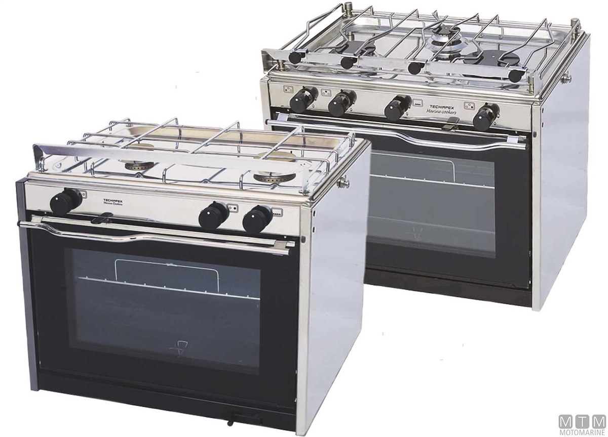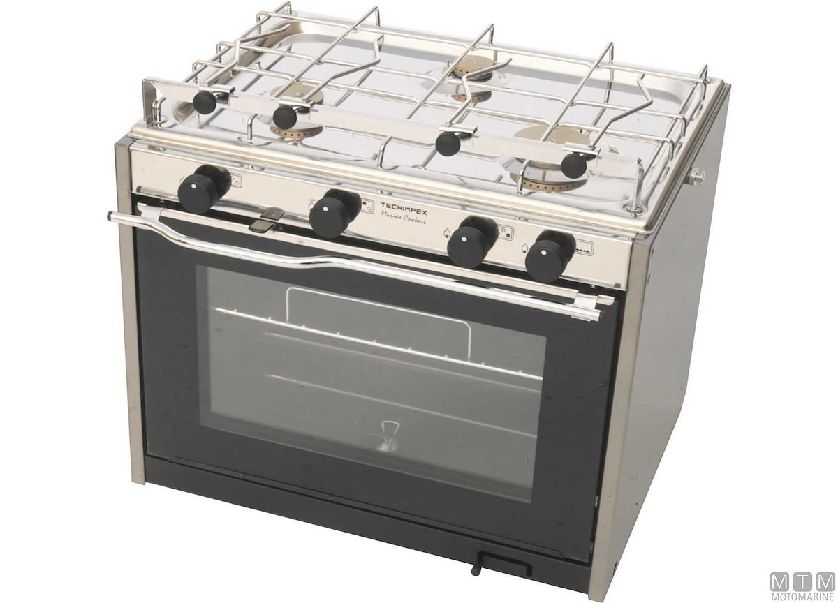 Cucine a gas Techimpex con struttura in Acciaio Inox e forno con cavità smaltata. Complete di termocoppie, spartifiamma in ottone massiccio, fermapentole per un fuoco, basculanti, griglia forno, doppio cristallo e ferma porta di sicurezza. Spondina parafiamma opzionale.