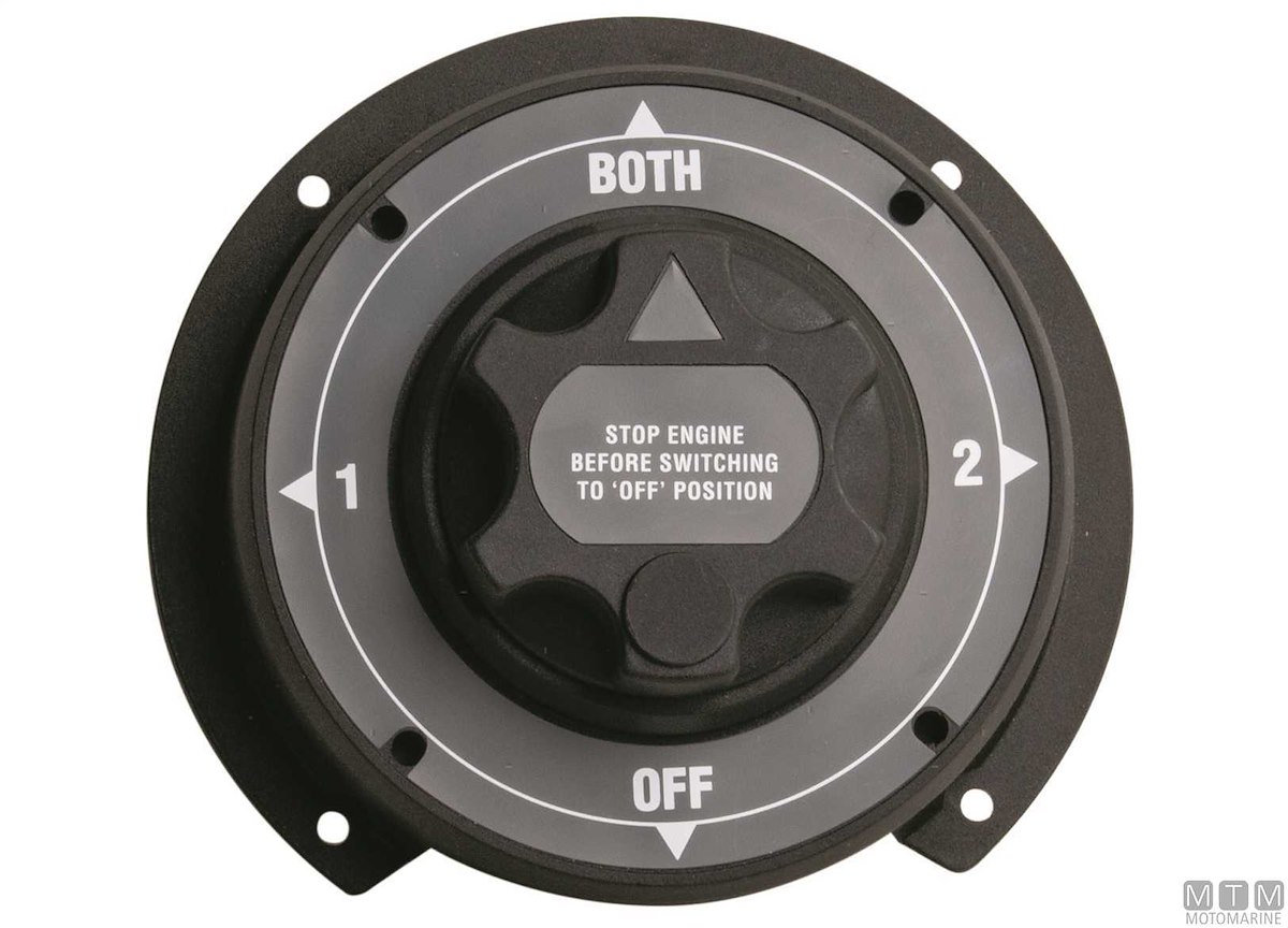 Deviatore staccabatterie di grande capacità tipo "Cole Hersee". Permette di staccare il circuito, di selezionare una delle due batterie oppure entrambe in contemporanea.