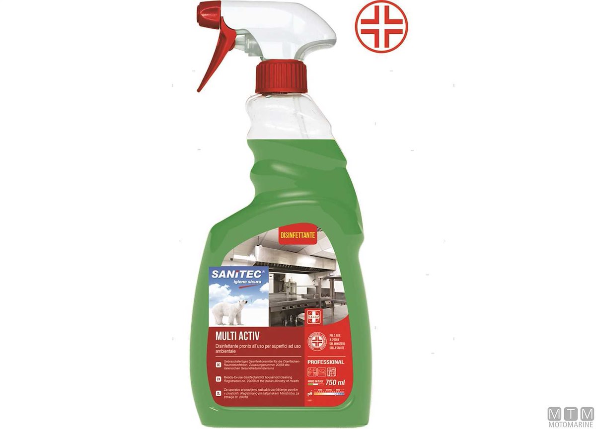 Disinfettanti Sanitec pronti all'uso per superfici ad uso ambientale.La versione Multi Activ con principio attivo antibatterico garantisce la rimozione da superfici lisce di batteri, funghi, muffe e cattivi odori.La versione Sani Active è studiata per disinfettare da germi e batteri e sgrassare a fondo tutte le superfici, anche in presenza di sporco ostinato.Presidi Medico Chirurgici, certificati H.A.C.C.P.