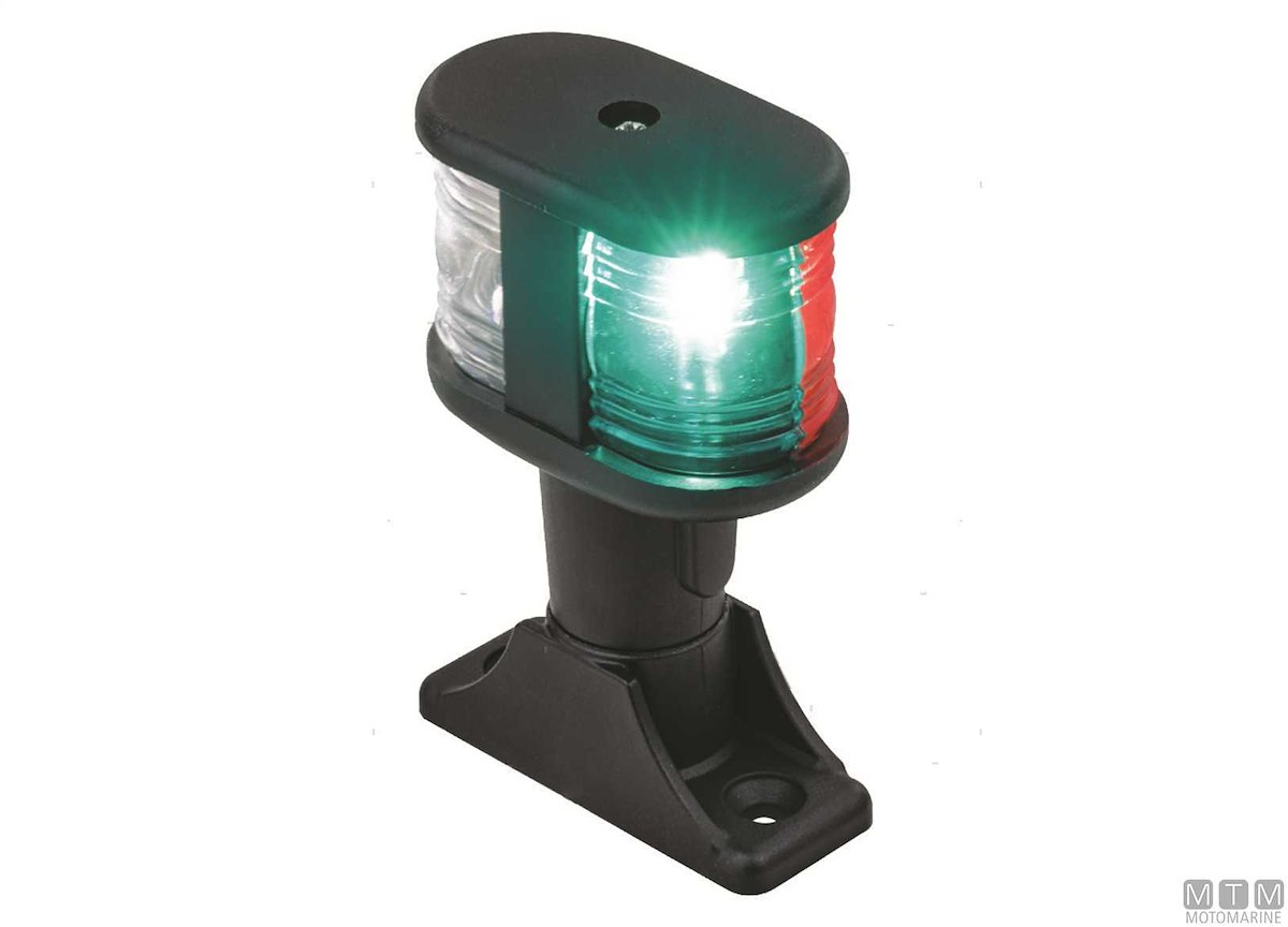 Fanali LED Tricolore 12V con luci di via e di poppa su base fissa per montaggio orizzontale.Certificati CE. Per imbarcazioni fino a 12 metri.Dimensione base: 64 x 25 x H100 mm