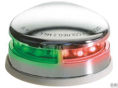 Fanale di prua bicolore 12V LED con cassa in Acciaio Inox e base in gomma.↵A normativa CE/USCG/COLREG/ABYC/NMMA.↵Dimensioni: 81 x 96 x H34 mm.