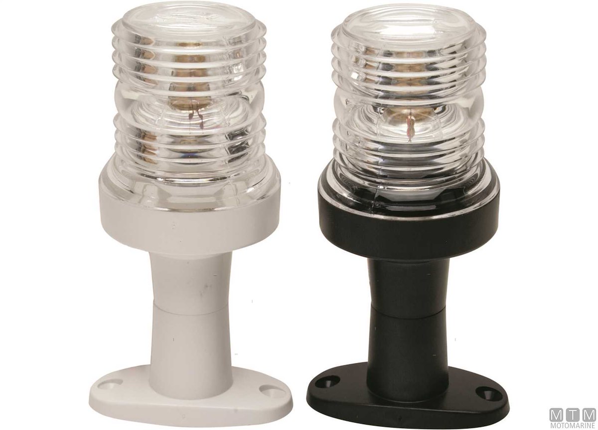Fanale di testa d'albero 12V con base stretta per imbarcazioni fino a 12 metri. Dimensioni base 34x64 mm, altezza fanale 124 mm.