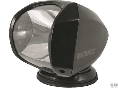 Faro radiocomandato Marinco con rotazione a 360° e 120° alto/basso. Bulbo alogeno da 100W con fascio luce profondo e uniforme, completo di due lampadine 1x12V e 1x24V per il doppio uso. Rivestimento in Tecnopolimero resistente raggi UV con protezione IP56. Completo di pannello radiocomando 55x57x19 mm fino a 65 m. Dimensioni faro: 190 x 190 x H235 mm. Base D145mm, con foro ponte D110mm.
