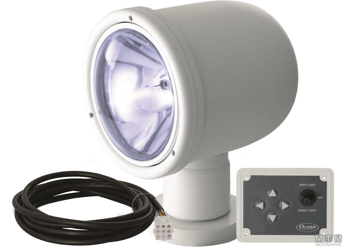 Faro orientabile con pannello di controllo cablato impermeabile con rotazione 360° x 70° alto/basso. Bulbo stagno allo XENON per una luce 7 volte più luminosa di un faro normale. Dimensioni: Lungh.350 mm - Largh.260 mm - H.320 mm. Comando wireless opzionale con ricevitore e trasmettitore plug and play fino a 35 m. Se installato, sostituisce il pannello controllo cablato. Per mantenere entrambi, è necessario acquistare il pannello doppia stazione.