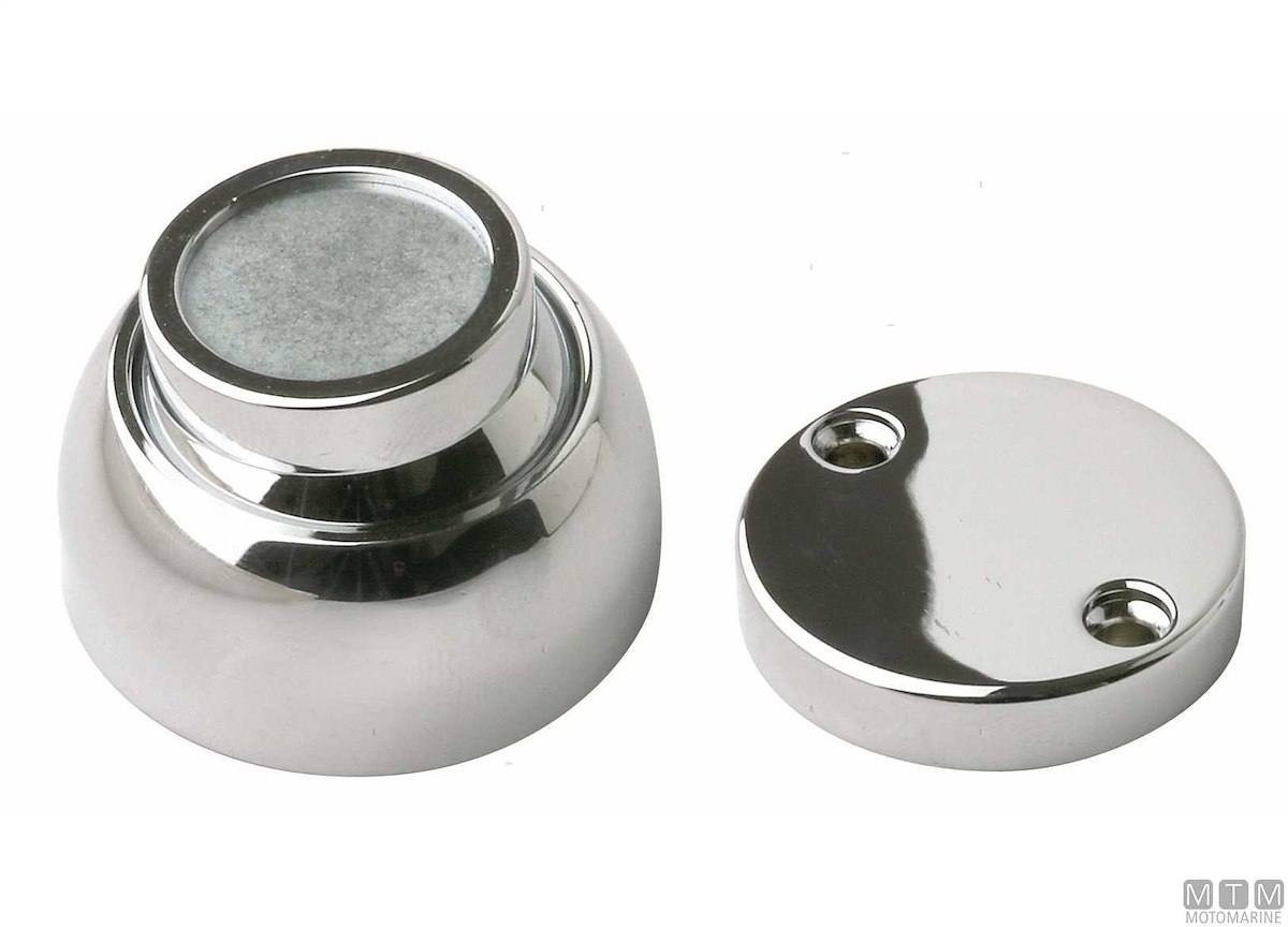 Ferma porte e portelli magnetico a calamita in Ottone Cromato con magnete orientabile fino a 20°. Composto da due parti: la prima viene montata esternamente, la seconda va incassata.