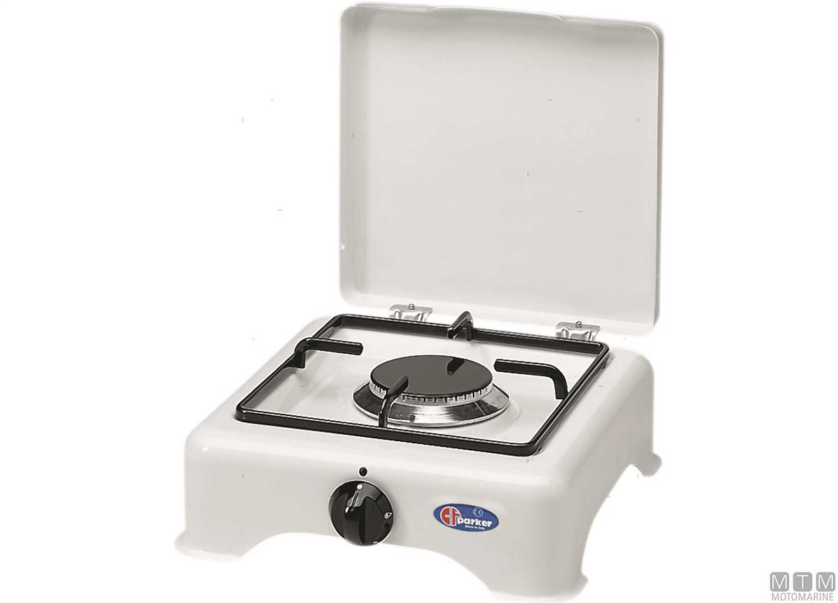 Fornello ad appoggio per esterni con coperchio, bruciatore in lega Pyral e spartifiamma con griglia smaltati neri. Potenza bruciatore 2500W.