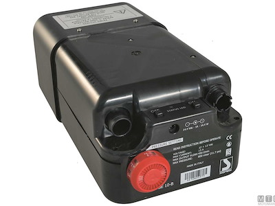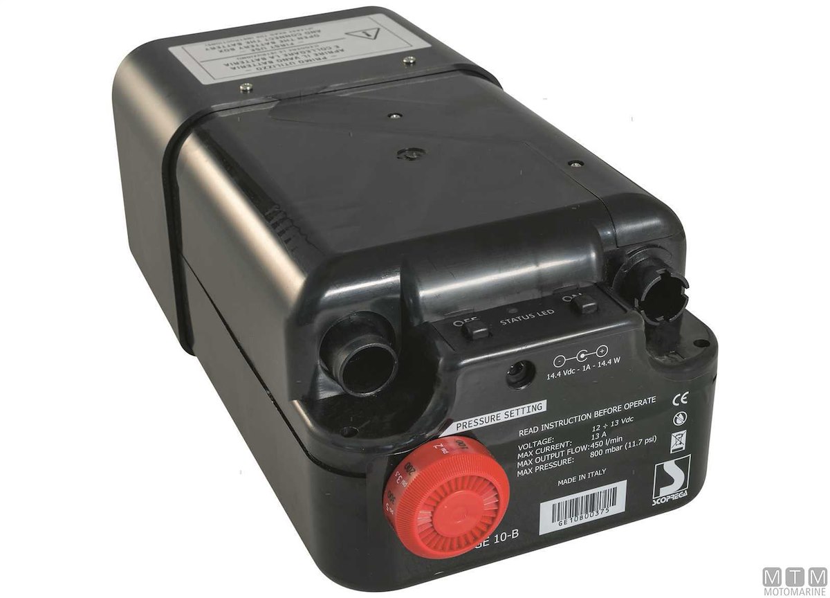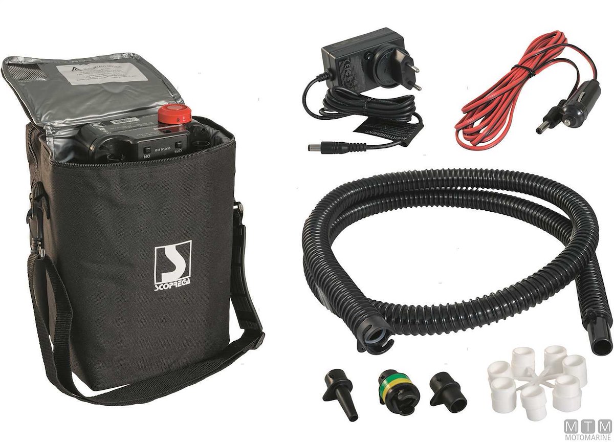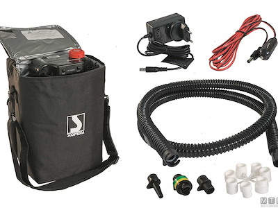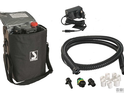 Gonfiatore elettrico ad alta velocità GE 10-B. Grazie al motore a due stadi può gonfiare o sgonfiare un battello da 4 metri in 5 minuti. Con borsetta a tracolla, tubo da 1,7 metri e raccordi multipli. Alimentazione con batteria ricaricabile integrata oppure con presa carica 220V. Consumo massimo 13A. Dimensioni: 18 x 20 x 30 cm.
