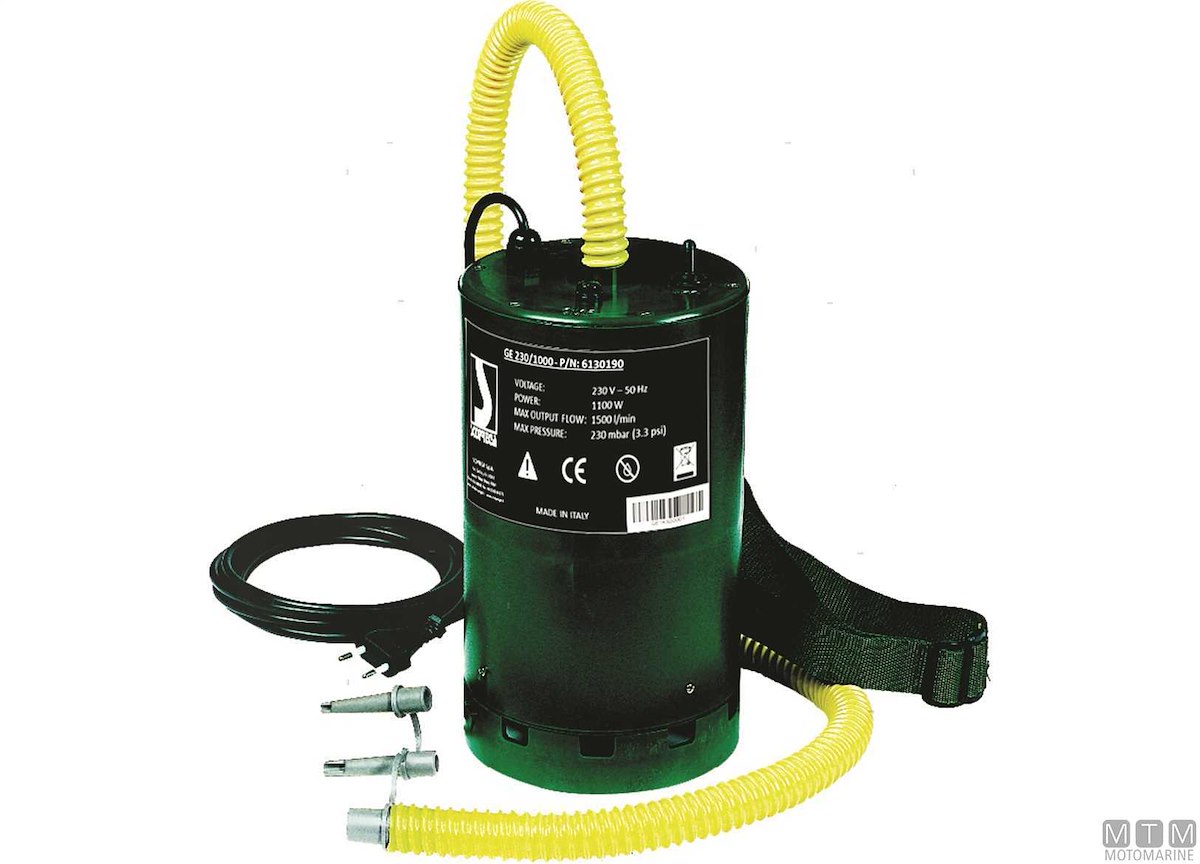 Gonfiatore elettrico professionale 220V in grado di portare a pressione in breve tempo qualsiasi gommone e struttura gonfiabile. Completo di raccordi multipli, può gonfiare e sgonfiare. Consumo 1100W. Dimensioni dia 17 x H27 cm.