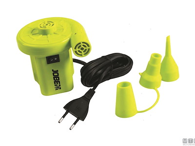 Gonfiatore elettrico Jobe Air Pump 230V con 3 raccordi diversi per adattarsi alla maggior parte delle valvole. 0,65 Ampere richiesti, pressione fino a 0,05 bar (0,74 psi), flusso d'aria 27,5 ft3|min.