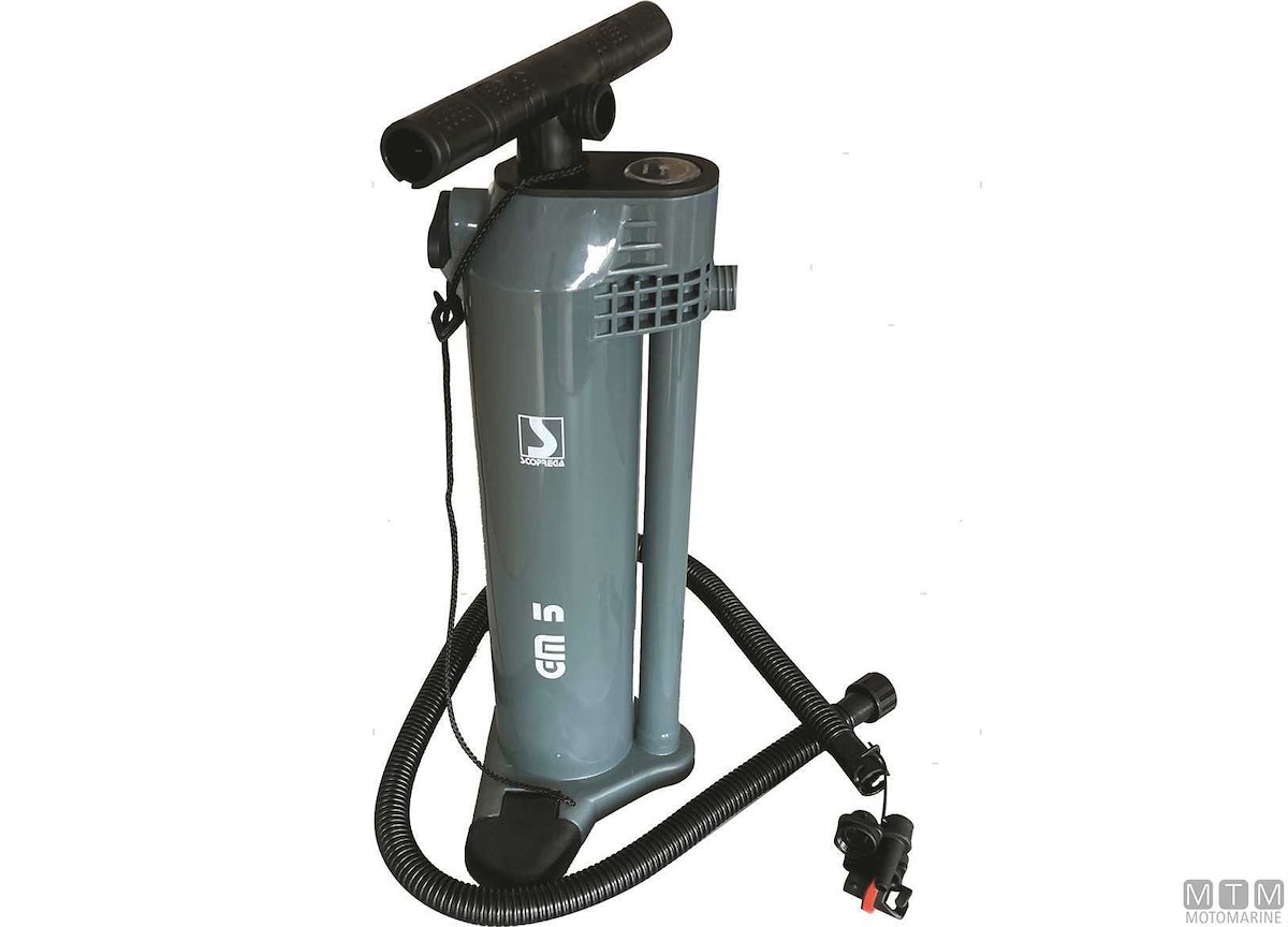 Gonfiatore manuale a flusso singolo/doppio commutabili, può gonfiare e sgonfiare. Corpo in ABS con camera interna in Alluminio Circal. Maniglia smontabile, piedi base pieghevoli, tubo da 1,25 m e raccordi multipli, manometro e convertitore a flusso singolo per ridurre lo sforzo e raggiungere la pressione massima. Dimensioni 17 x 16 x H51 cm quando piegato senza maniglia.