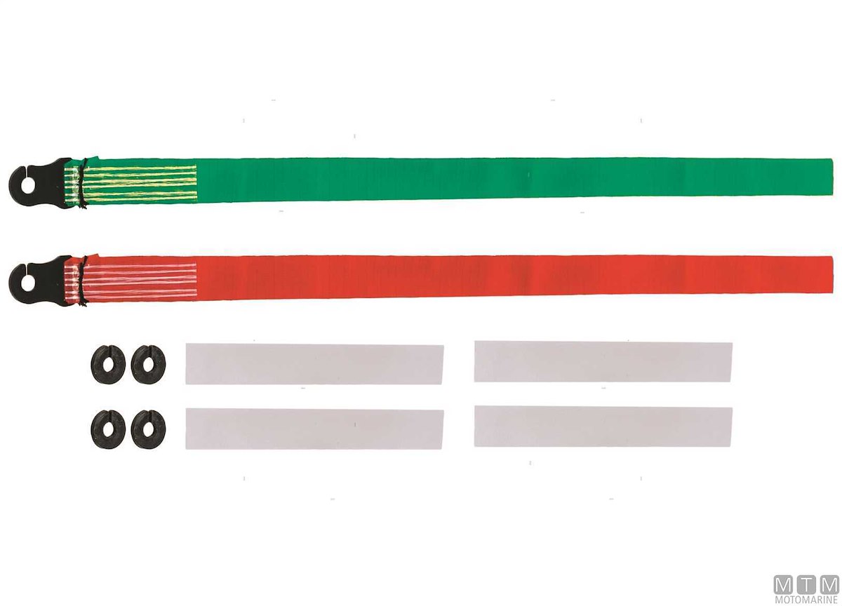 Indicatori direzione vento in Nylon retinato antistrappo. Si attaccano senza attrezzi sul sartiame con due rondelle a incastro. Comprende due indicatori rotanti 360° colore rosso e verde.