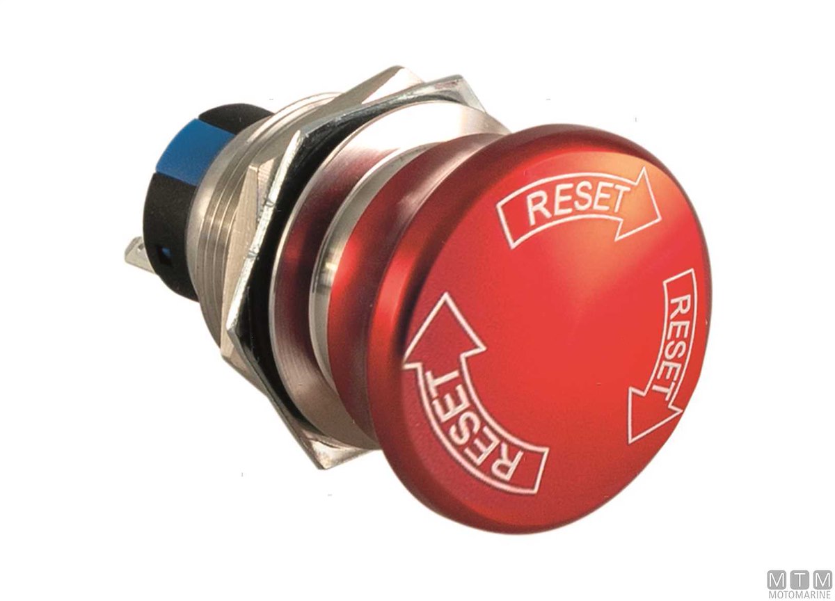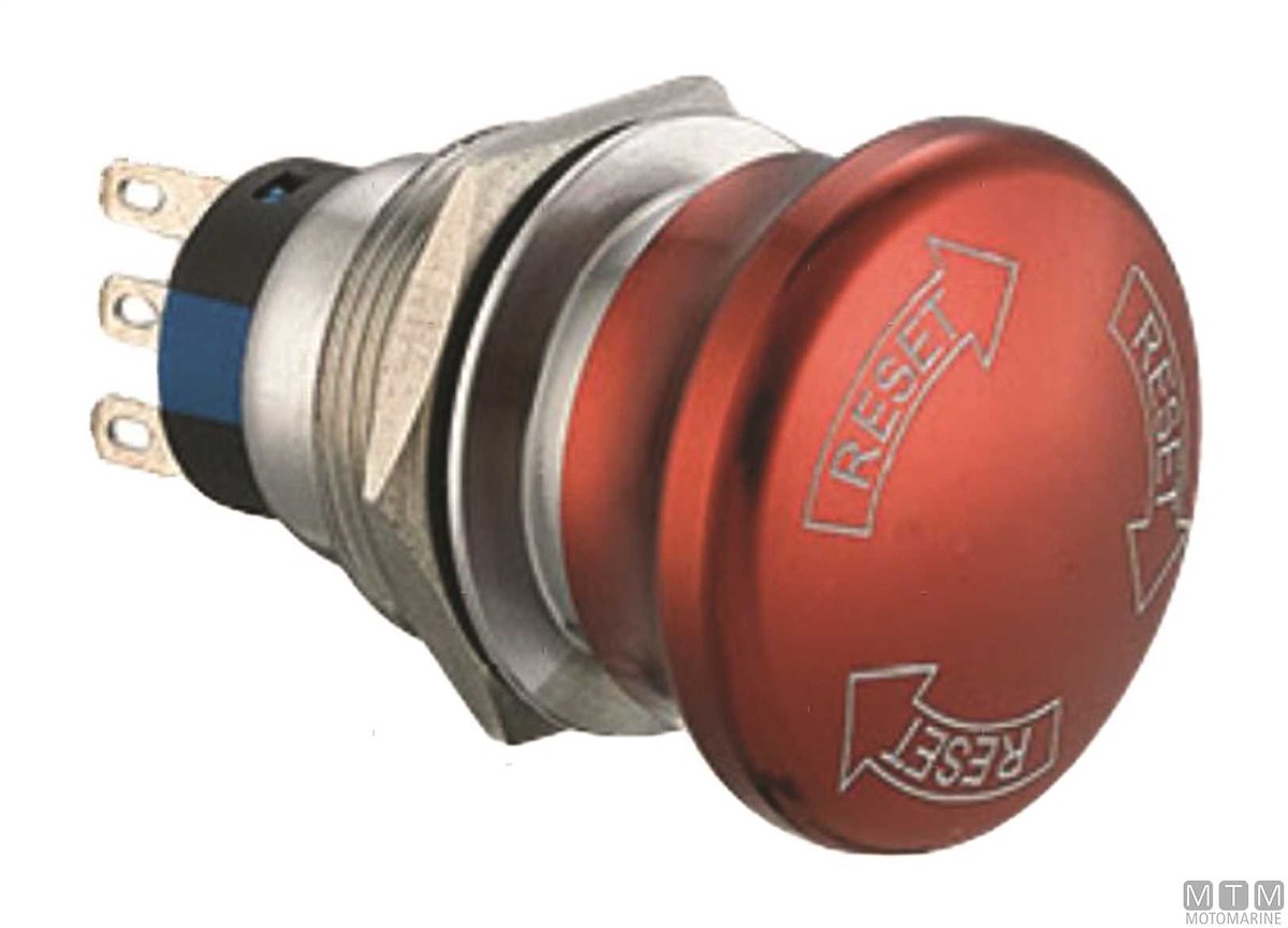 Interruttore di emergenza con corpo in Acciaio Inox. Diametro foro 22 mm, altezza incasso 38 mm.