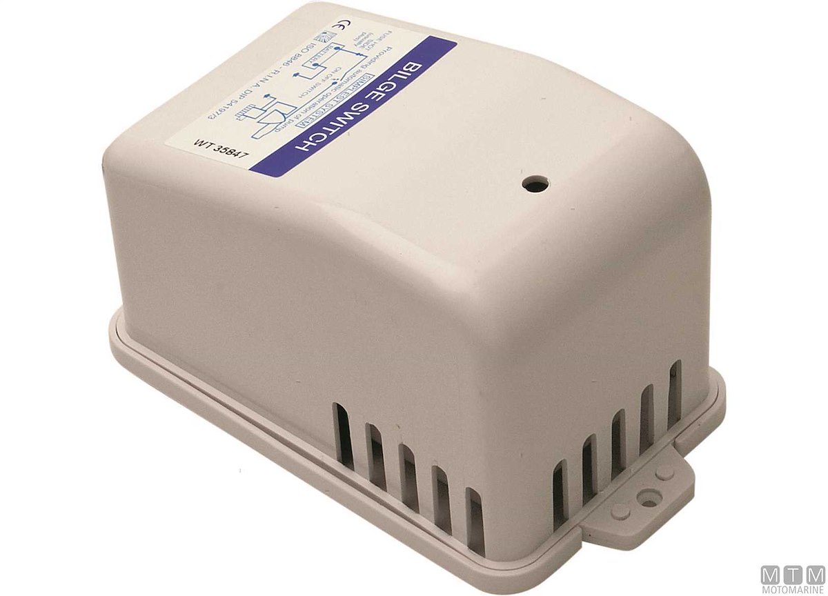 Interruttore per pompe di sentina con galleggiante a leva e protezione.