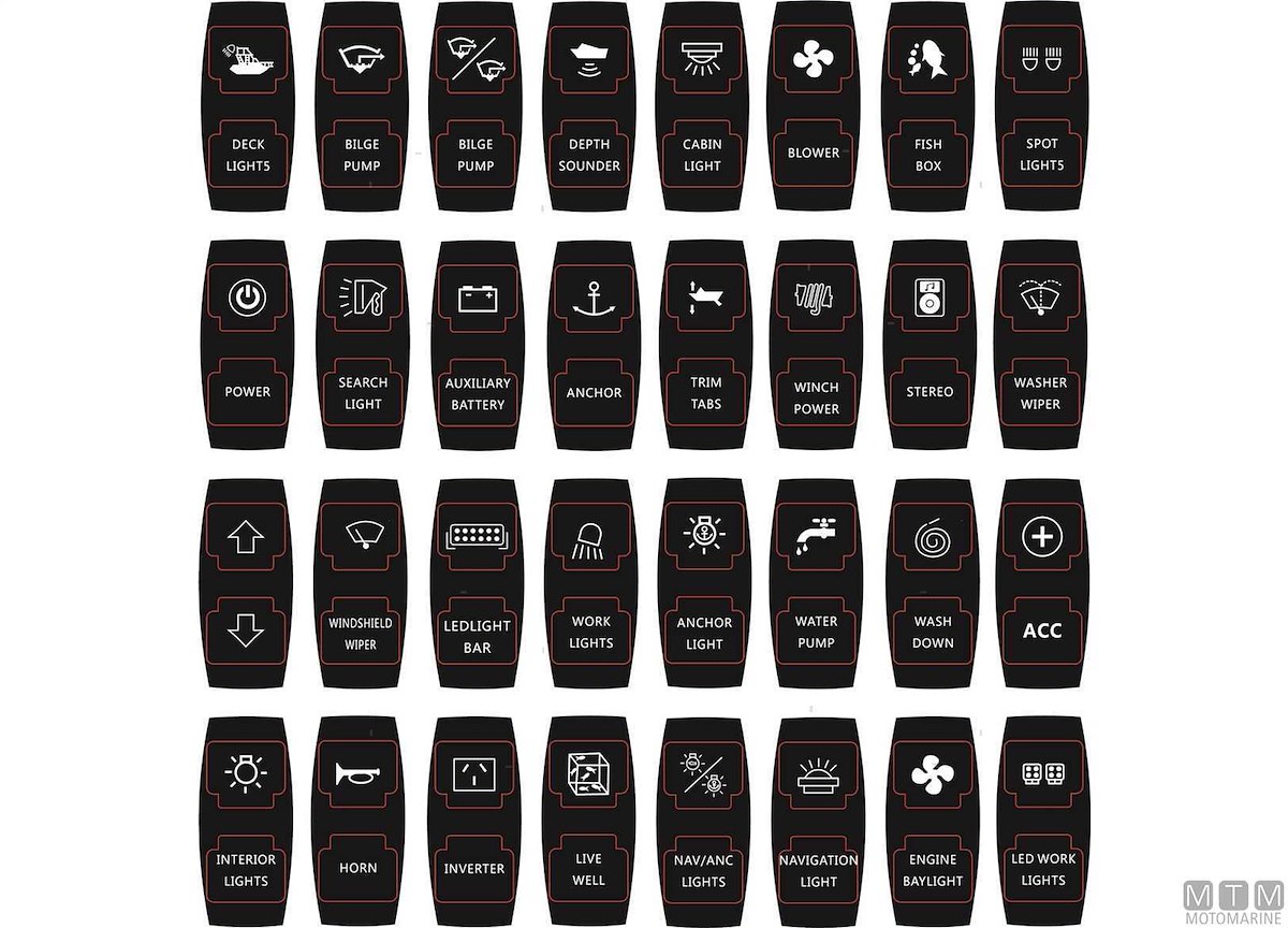 Interruttore basculante impermeabile IP68 con guarnizione in Nitrile. Completo con set da 32 etichette intercambiabili da inserire ad incastro sotto la bascula. Il simbolo dell'utenza è sempre illuminato (LED rosso), il testo descrittivo si illumina (LED bianco) quando l'interruttore viene azionato. Circuito bipolare 12/24V-20A.