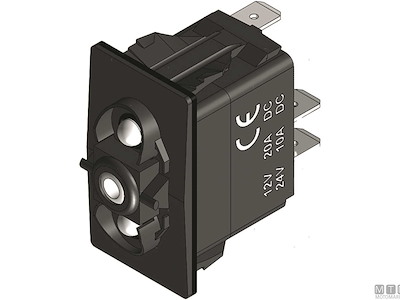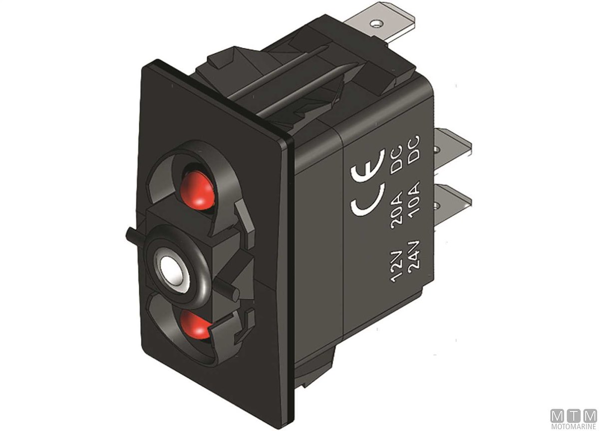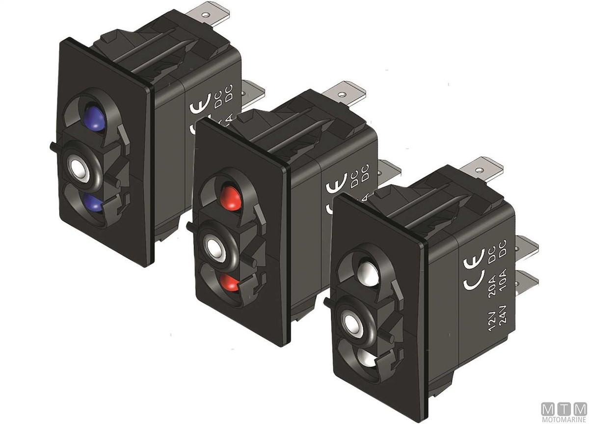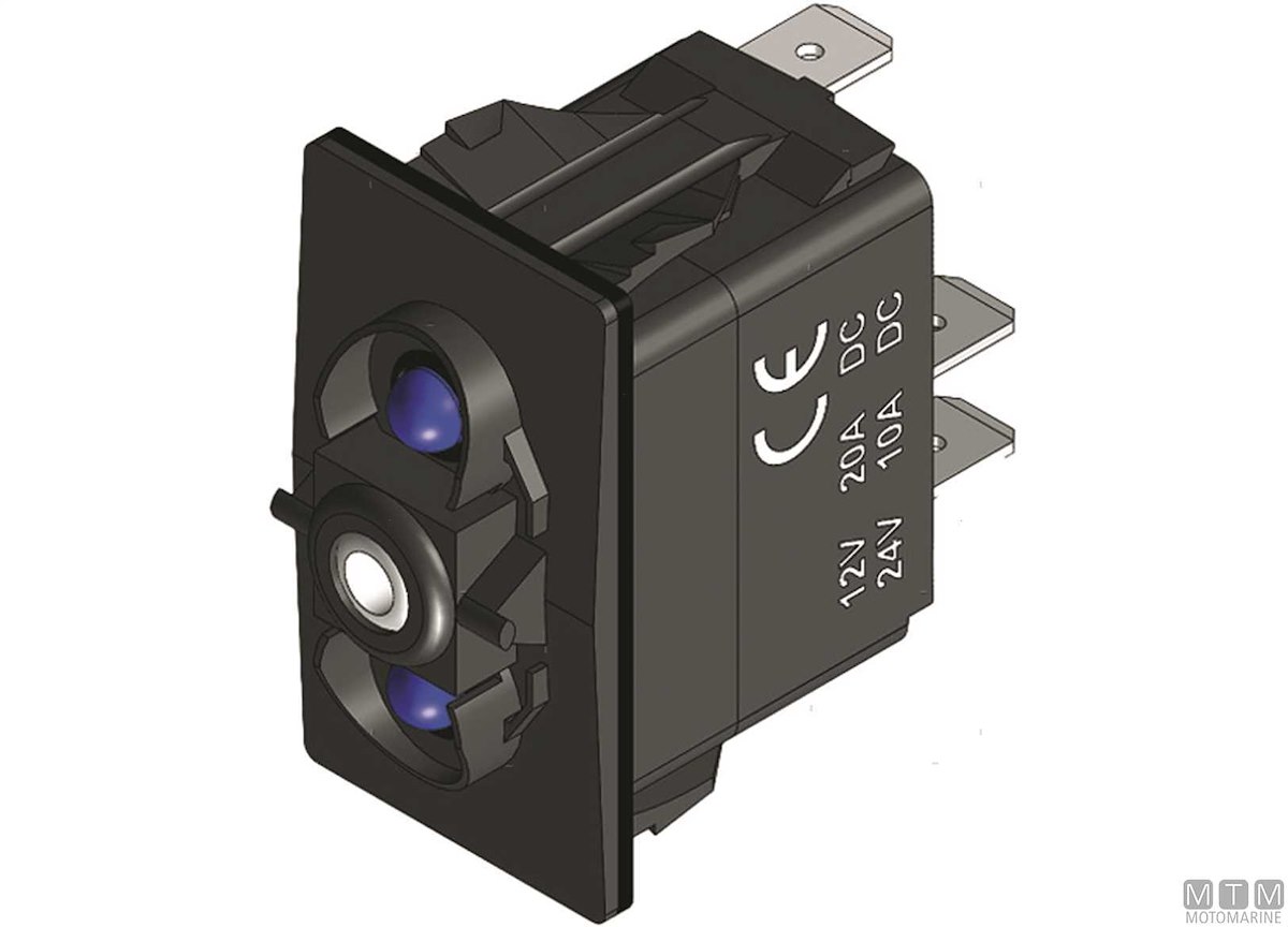Interruttore basculante 12/24V-20A bipolare impermeabile IP68 misura Carling con guarnizione in Nitrile e due luci LED bianche/rosse/blu. Da completare con bascula a scelta.