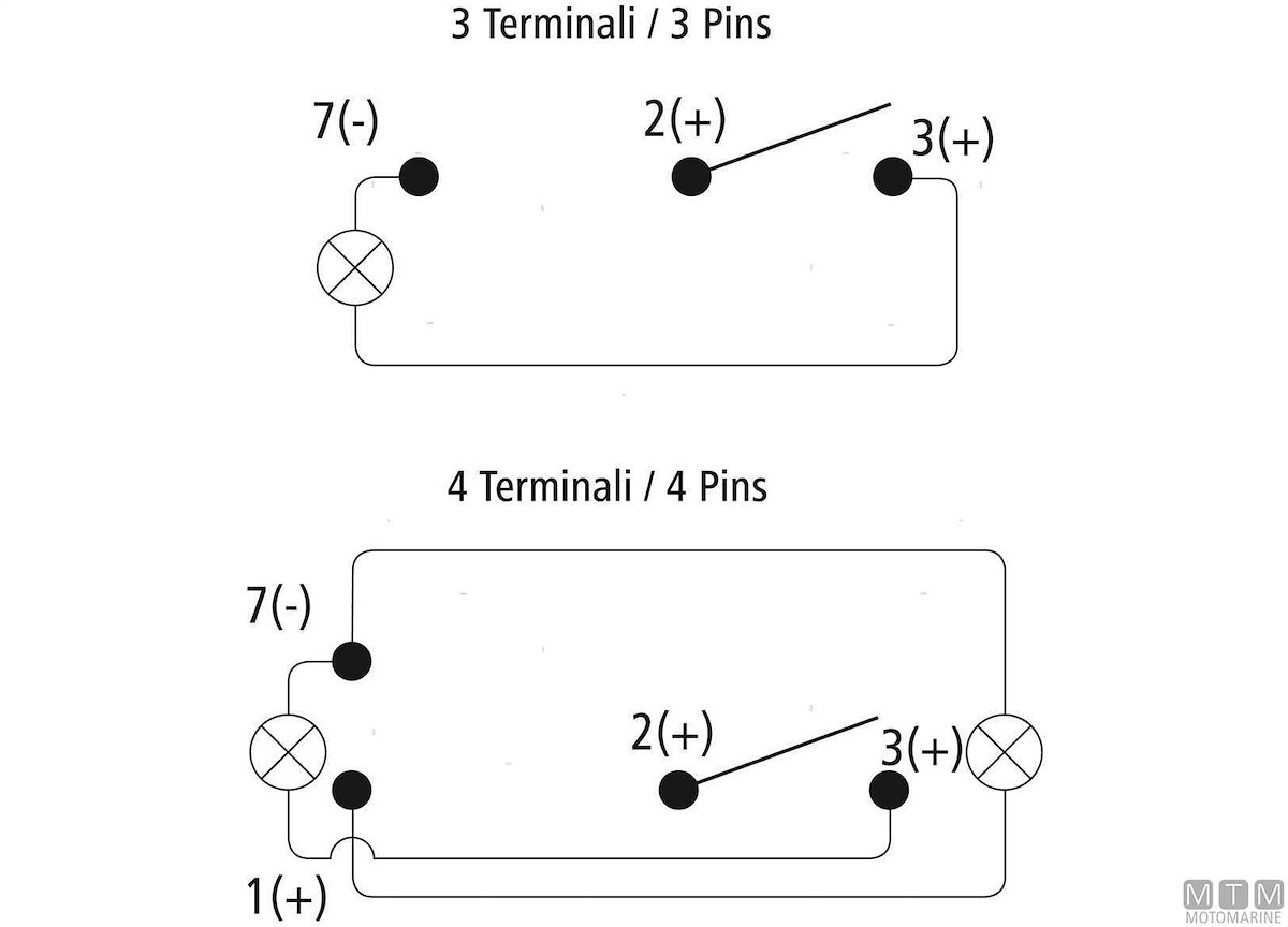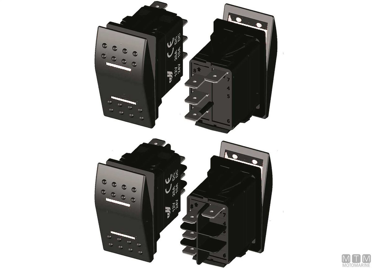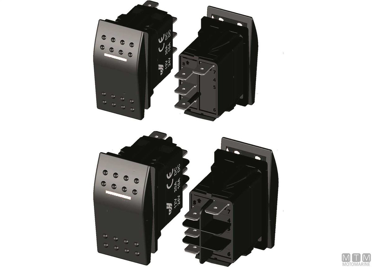 Interruttori basculanti 12/24V (20/10A) impermeabili IP68 con guarnizione in Nitrile.Con luce LED bianca che si illumina quando l'interruttore viene azionato.