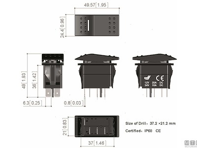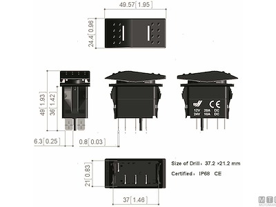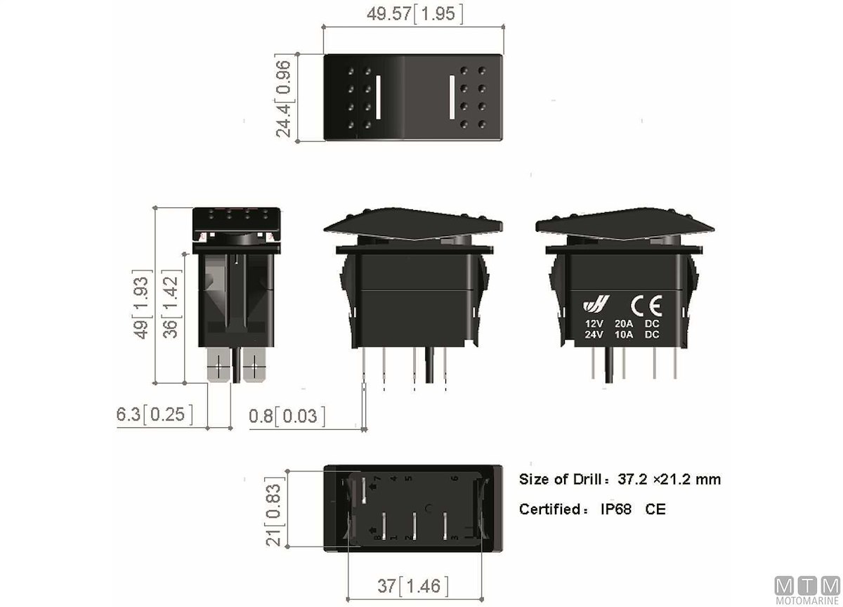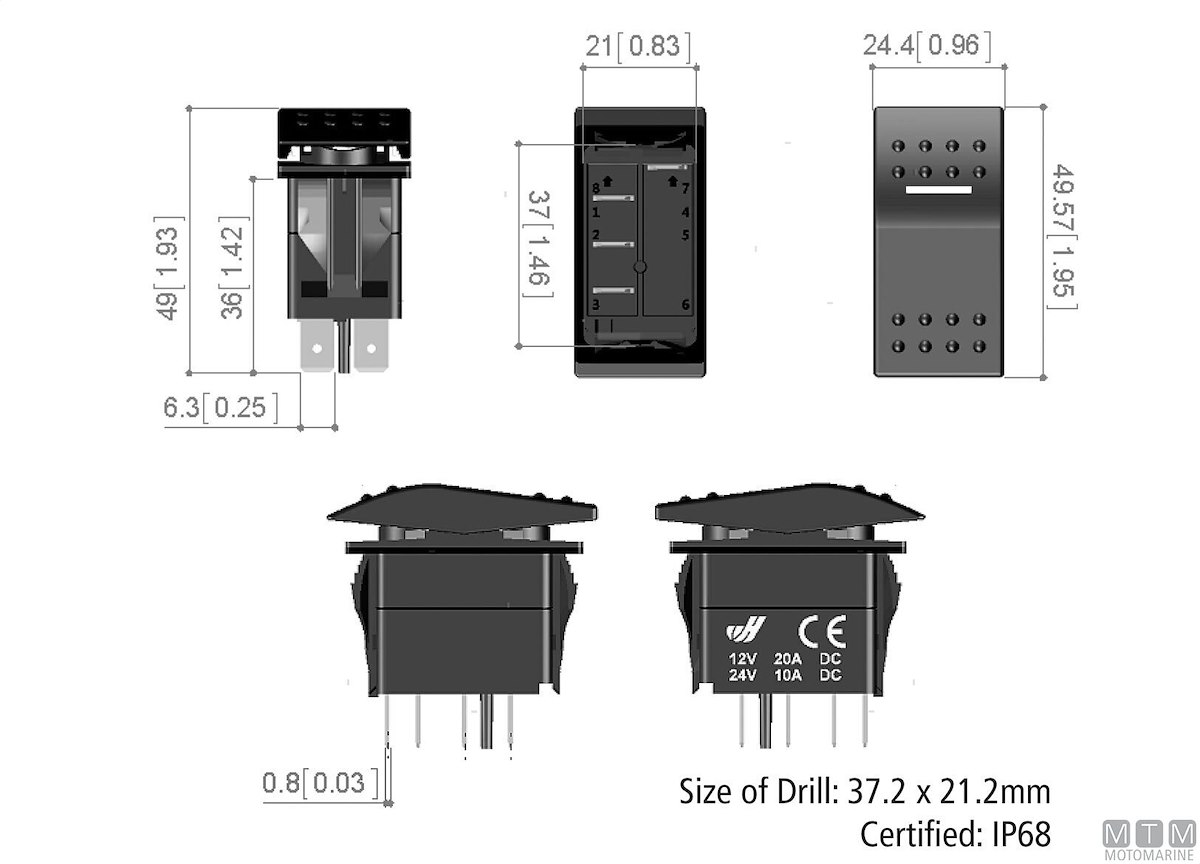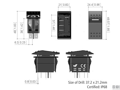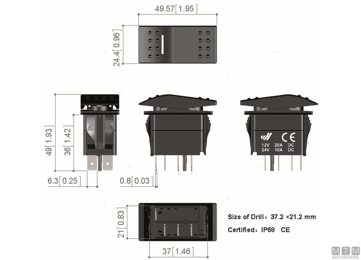 Interruttori basculanti 12/24V (20/10A) impermeabili IP68 con guarnizione in Nitrile.Con luce LED bianca che si illumina quando l'interruttore viene azionato.