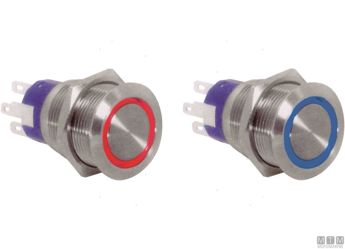 Interruttore a pulsante 12/24V impermeabile IP67 con luce LED e corpo in Acciaio Inox. Montaggio a filo con foro da 19 mm. Altezza incasso 38 mm.