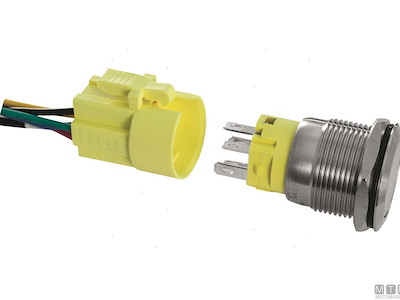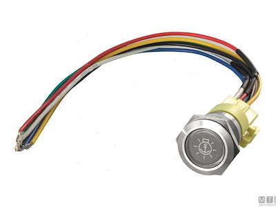 Interruttore a pulsante 12/24V impermeabile IP66 con luce LED e corpo in Acciaio Inox. Con il quadro alimentato, l'interruttore è sempre illuminato con LED rosso, si illumina con LED bianco quando l'interruttore viene azionato. Completo con connettore precablato per un semplice montaggio o sostituzione. Montaggio a filo con foro da 19 mm. Altezza incasso 41 mm. Da completare con set etichette con 185 simboli differenti.