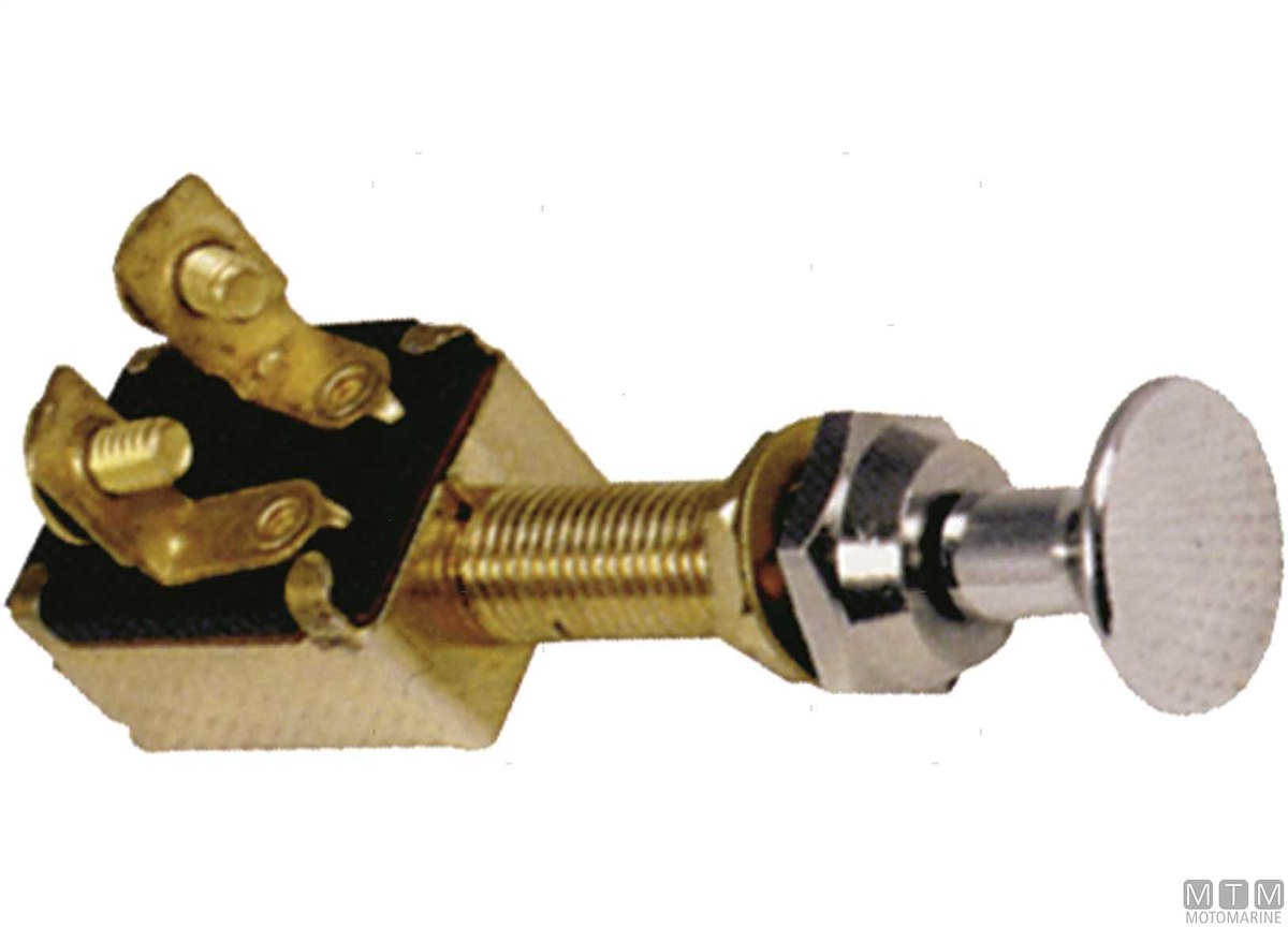 Interruttore con corpo in Ottone e pulsante a tiretto in Ottone Cromato. Due terminali per 1 circuito. Foro da 9 mm, altezza incasso max 55 mm.